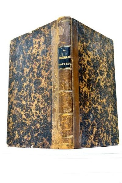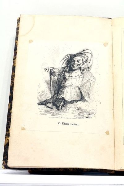 in-4. Frontispice. Titre. XVI. 377 pages. 1 feuillet. (26x17cm). Demi-basane. Pièce de titre. Dos frotté et épidermé. Coins émoussés. Papier bruni. Marque angulaire de mouillure claire à une trentaine de pages. Quelques rousseurs, plus prononcées sur une quinzaine de pages. Bon état général. Frontispice de Brévière, appliqué sur Chine, et 140 illustrations dans le texte de Tony Johannot, gravés par Brévière, Royget, Desmarest, Briouste. C’est avec le Diable boiteux que Lesage s’annonce comme romancier de premier ordre. Le succès du roman, qui fut considérable, acheva enfin de distinguer le nom de Lesage de la foule des écrivains. Cette dernière œuvre donna cours à plusieurs anecdotes. Deux seigneurs se disputèrent le dernier exemplaire de la seconde édition en mettant l’épée à la main dans la boutique du libraire Barbin.