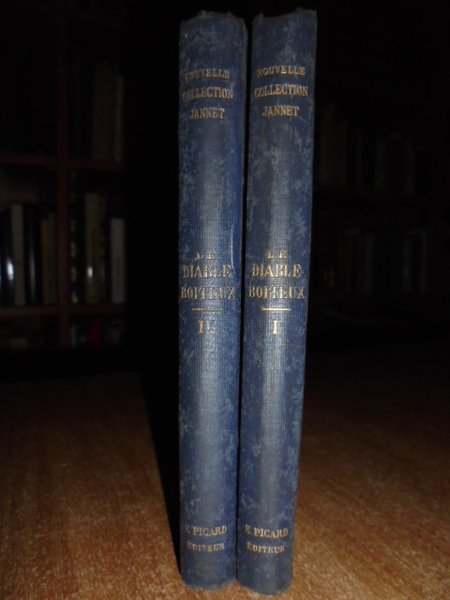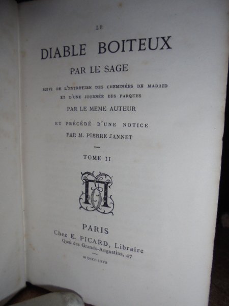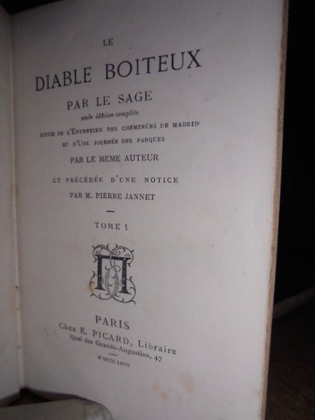 Le Sage. Paris, Chez E. Picard, Libraire, 1868. Le Diable Boiteux par Le Sage seule édition complète. Suivie de l' Entreien des cheminées de Madrid et d' une journée des parques par le meme Auteur et précedée d' une notice par M. Pierre Jannet. 2 volumi in-16°, tela coeva con titoli in oro sui piani e nei dorsi. xvi, 235, (5) pp.; 278, (1) pp. Esemplare ben conservato. Neg. esot.