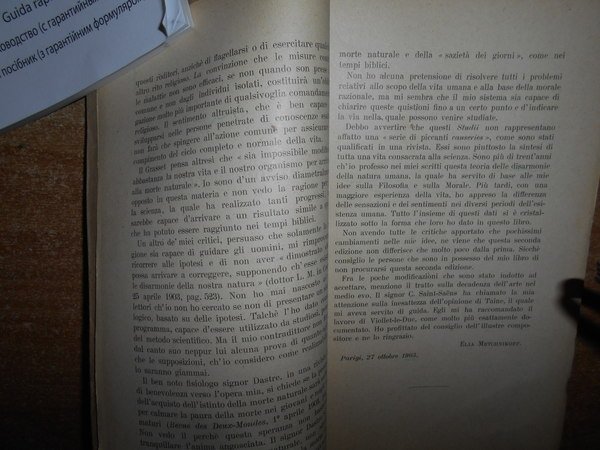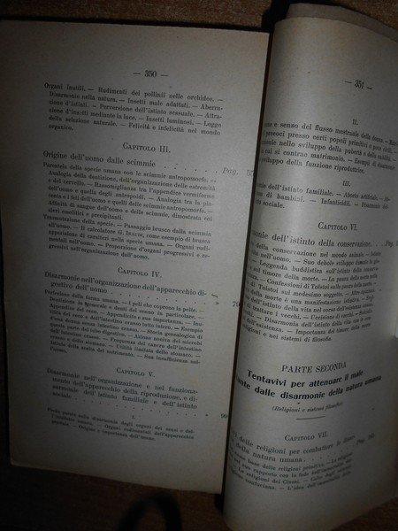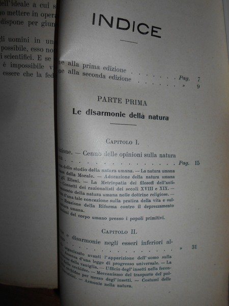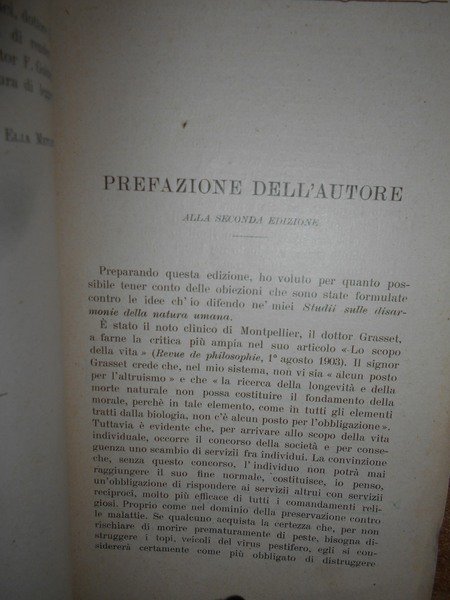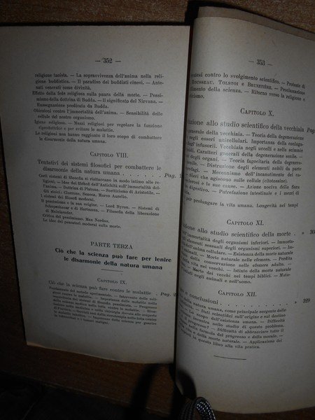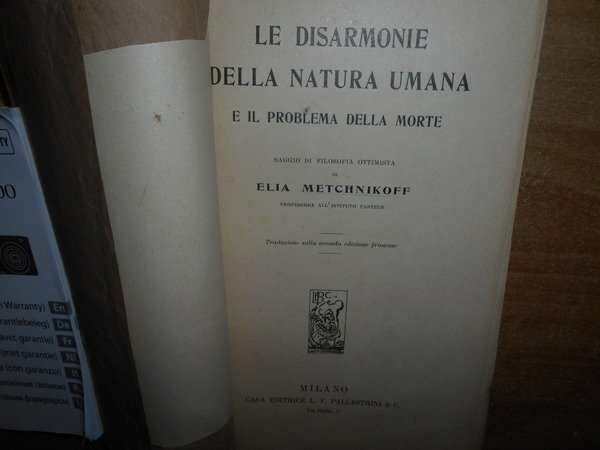Elia, Metchnikoff. Milano, Casa Editrice L.F. Pallestrini & C., 1906. Le Disarmonie della Natura Umana e il problema della morte. In-16° grande, br. con sovracopertina, titolo manoscritto. 353 pp. con alcune illustrazioni nel testo. Lievi sottolineature a matita in alcune pagine ma in ottimo stato di conservazione. Raro. Neg. mob. 14 alto entro busta trasp.