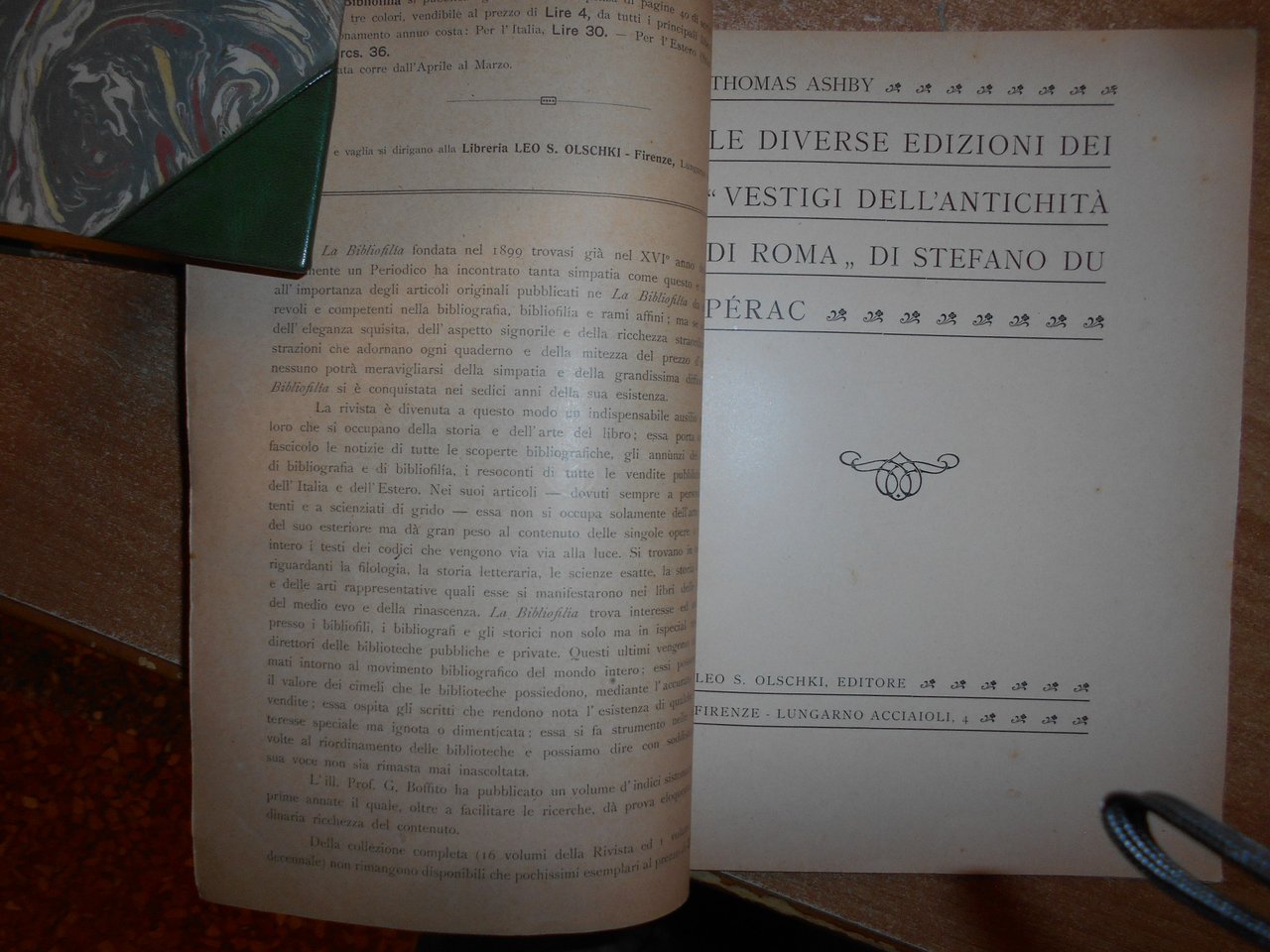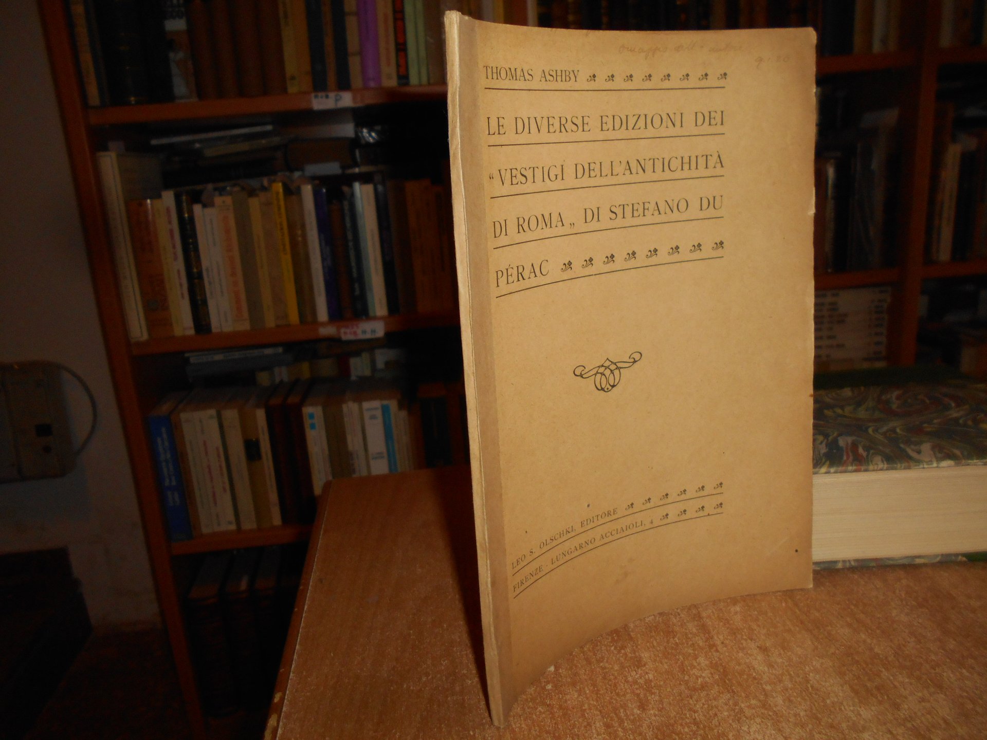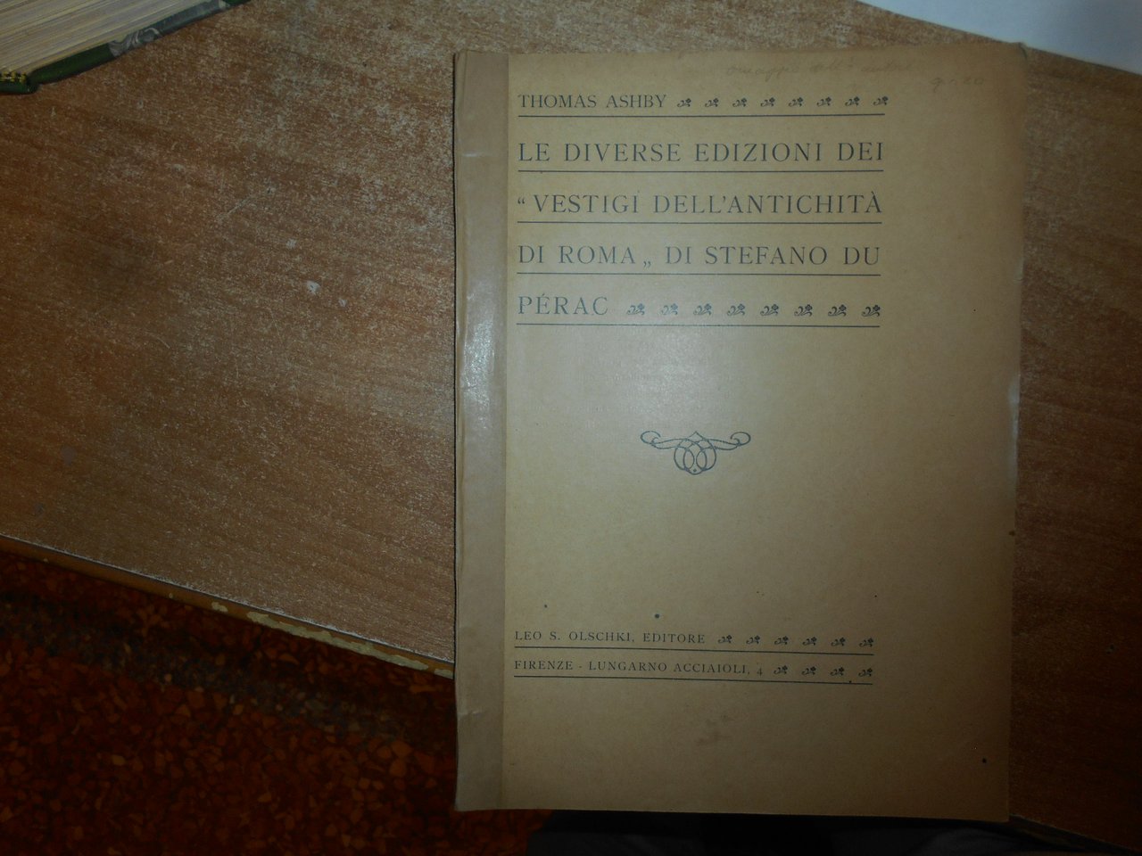 THOMAS ASHBY. Firenze, Leo S. Olschki, 1915. Le diverse edizioni dei "Vestigi dell' Antichità di Roma" di Stefano Du Pérac. In-8° grande, br. 23 pp. con alcune illustrazioni n.t. Raro opuscolo con la brossura posteriore capovolta. Neg. mob. 2 entro busta trasp.