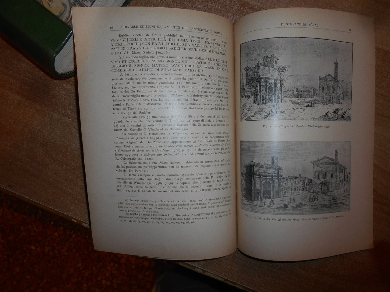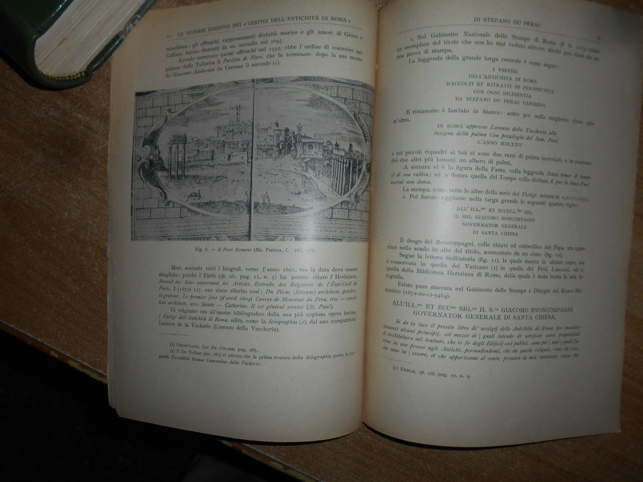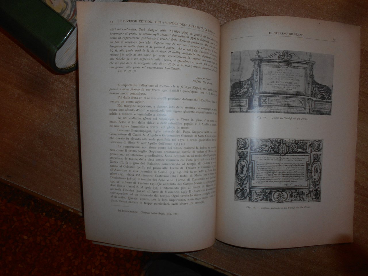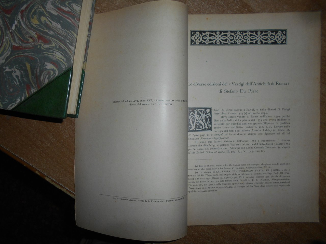 THOMAS ASHBY. Firenze, Leo S. Olschki, 1915. Le diverse edizioni dei "Vestigi dell' Antichità di Roma" di Stefano Du Pérac. In-8° grande, br. 23 pp. con alcune illustrazioni n.t. Raro opuscolo con la brossura posteriore capovolta. Neg. mob. 2 entro busta trasp.