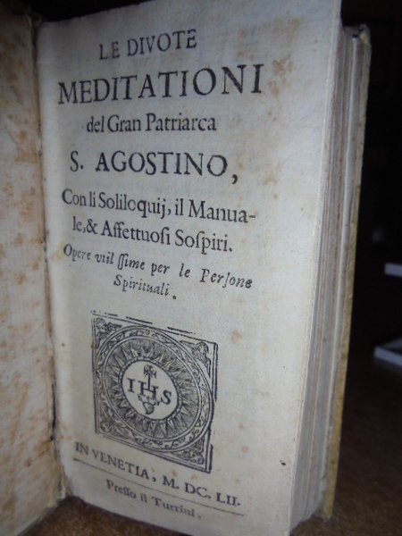 Le Divote Meditationi del Gran Patriarca S. AGOSTINO con i Soliloquij, il manuale, & Affettuosi Sospiri. Opere utilissime per le persone spirituali. In Venezia presso il Turrino, 1652. In-24° (cm. 12 x 6), pergamena coeva. 333 pp. Buon esemplare. Neg. esot. mob. 30