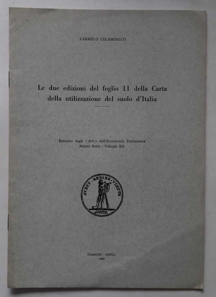 le due edizioni del foglio 11 della Carta della utilizzazione del suolo d'Italia. Estratto dagli 2Atti" dell'Accademia Pontaniana - Nuova SErie - Volume XII. Sulla brossura del fascicolo lievissimi segni del tempo, interno pulito e ben tenuto. 5 Buono (Good) .