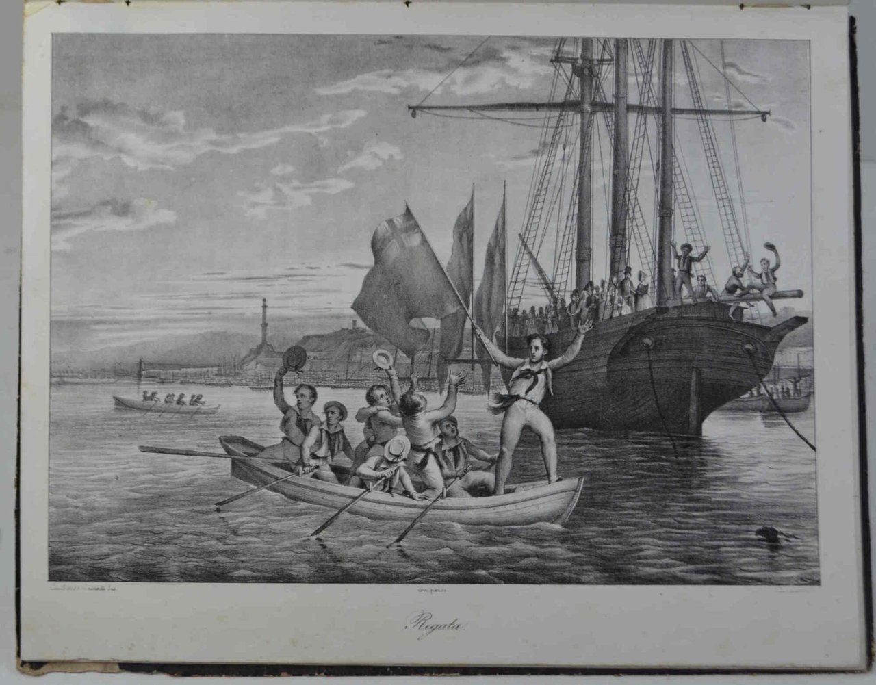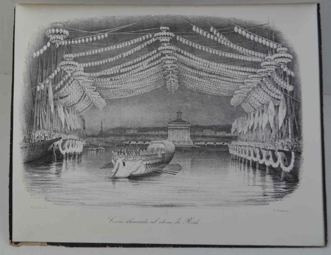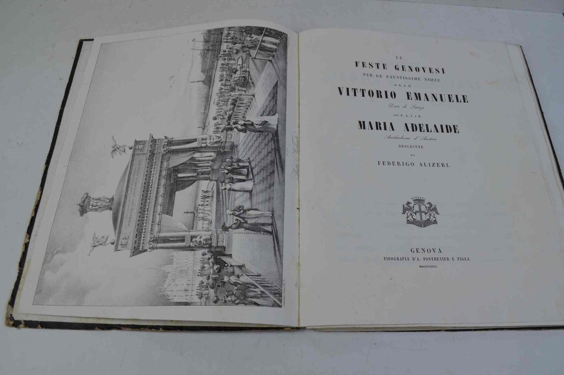 Cm. 32, pp. 75 (1). Con 10 belle tavole f.t. in litografia. Legatura originale in cart. ricoperto da percallina decorata. Piccole mancanze superficiali esterne, peraltro esemplare genuino e ben conservato. Bel volume che descrive ed illustra i festeggiamenti genovesi in occasione dell'evento descritto nel titolo. Non comune.