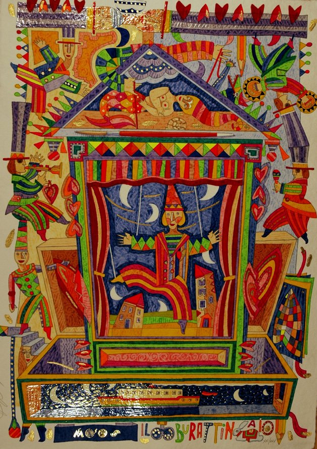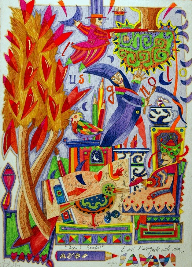 In folio; pp. non num. 28 a quartini sciolti su carta a mano appositamente fabbricata; sono presenti: 6 splendide serigrafie a 35 colori, sciolte, numerate e firmate a matita dall'Artista oltre ad una al piatto della cartella; un multiplo a serigrafia, collage e balsa, num. e firmato. Le pagine di testo e i disegni che le accompagnano sono pure eseguite in serigrafia; il tutto racchiuso in contenitore di legno eseguito a mano ad Udine da Delmo, abilissimo artigiano del legno. Edizione limitata a complessivi 170 esempl. numerati di cui XXV, come il presente, a num. romana e 5 prove siglate H.C. Splendida cartella, vero e proprio esempio di "livre d'Artiste", ogni serigrafia è impreziosita con floccaggi, metalli impressi, inserti di balsa fustellata, fondi polimaterici e particolari arricchiti con glitter.<BR>(vedi riproduz.)
