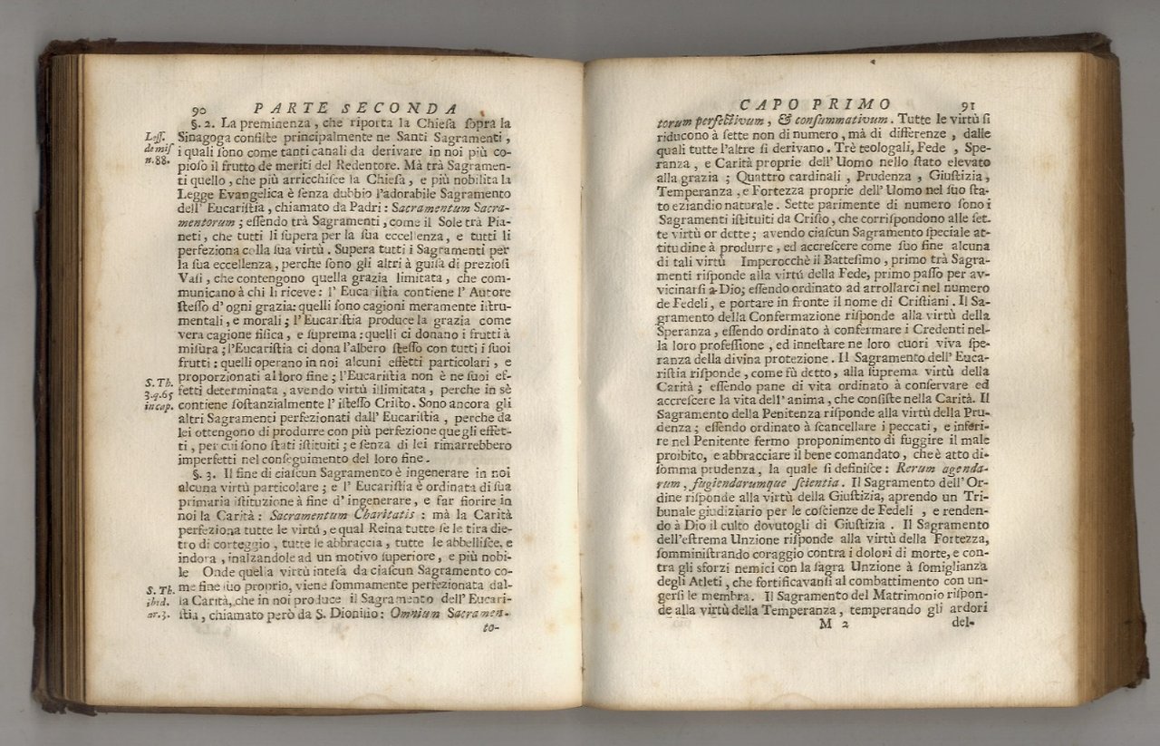 Napoli, Nella Stamperia Abbaziana, si vendono nella Libreria del Sig. Gio.Massimo Porcelli, 1754, in-4, piena pergamena coeva, pp. (12), 389, (11). Belle testate ed iniziali in xilografia. Mancanza al dorso, pergamena brunita; gore residue da umidità alle prime carte e nella porzione finale del volume (queste prevalentemente ai margini bianchi); qualche fioritura. Dedica a stampa di Niccolò Petrini (figlio di Paolo: incisore, stampatore e libraio in S. Biagio) alla badessa D. Cornelia Piscicelli, d'illustre famiglia patrizia napoletana (che nei secoli XVII e XVIII al monastero dette diverse componenti, sia come suore che badesse); nell'educandato e nel convento benedettino di S. Gregorio Armeno (la cui clausura divenne più stretta solo dopo il Concilio di Trento) confluivano molte fanciulle della nobiltà; qui, per antica norma, si diveniva badessa solo per provenienza dal Sedile di Capuana o dalla "Regio Nilensis", cioè dal centro antico di Napoli, ove massima era la concentrazione di palazzi nobiliari. Dal 1922 le Suore crocifisse adoratrici dell'Eucarestia (Ordine fondato nel 1885 ed approvato nel 1915) sono subentrate alle benedettine.