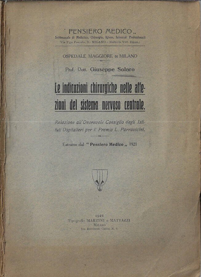 Relazione dell'Onorevole Consiglio degli istituti Ospitalieri per il premio L. Parravicini, estratto dal "Pensiero Medico" settimanale di medicina. Copertina in cartoncino morbido, ingiallita dal tempo mostrante segni di usura ai margini ed ai piatti ove presenti sporadiche macchioline scure; piccolo segno a matita al piatto anteriore e timbro precedente al piatto posteriore. Pagine ad ampio margine, brunite ma fruibili. Numero pagine 115.