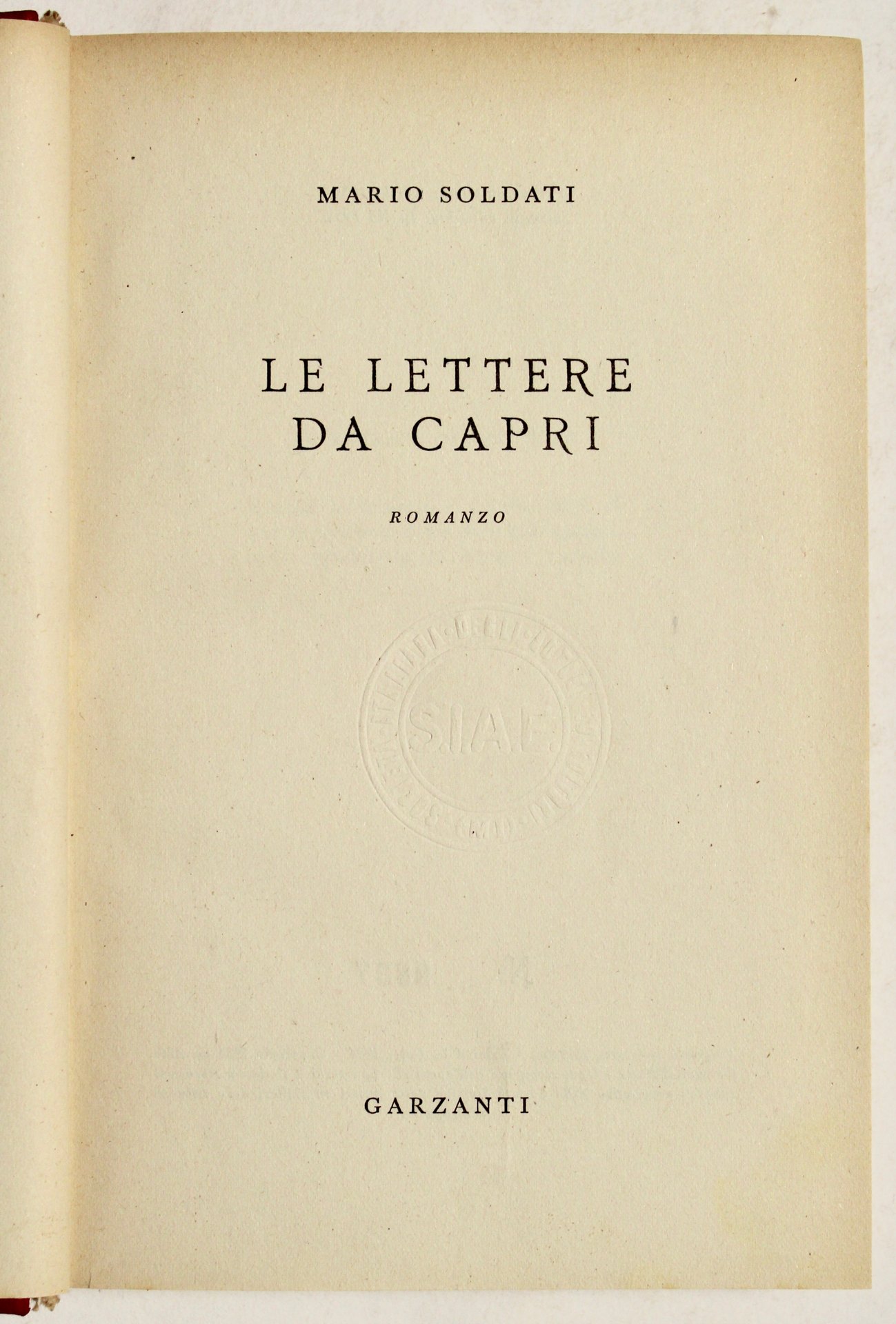Cm 20x13,5, pagg. 352; tela rossa. Buon esemplare senza sovracoperta, una firma di appartenenza al foglio di guardia Le lettere da Capri di Mario Soldati è il romanzo dell'ossessione che nasce dal conflitto tra sesso e sentimento, vincitore del Premio Strega nel 1954. "Le lettere da Capri", forse il libro più problematico e sfaccettato dell'autore, racconta un'intricata storia di amore e gelosie, ambiguità e finzioni: quella di Harry, colto americano studioso d'arte che vive in Italia, lacerato dall'opposizione tra la moglie Jane e la prostituta romana Dorothea, oggetto di un'attrazione feroce e morbosa. Vera e propria confessione, il romanzo è il resoconto spietato di un quadrato amoroso: un gioco di specchi e di inganni reciproci dal quale emerge prepotente come un grido il rifiuto del perbenismo, la voglia di evasione dai sensi di colpa e dalle costrizioni e il ritratto di una società in bilico tra convenzioni e rivolta.