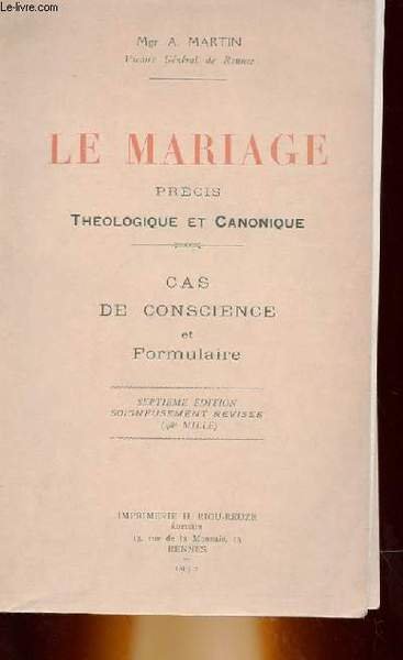LE MARIAGE - PRECIS THEOLOGIQUE ET CANONIQUE - CAS DE CONSCIENCE ET FORMULAIRE + SUPPLEMENT