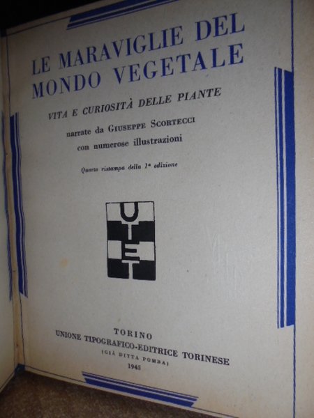 Vita e curiosità delle piante narrate da Giuseppe Scortecci con numerose tavole in nero e a colori fuori testo. Torino, UTET (già Ditta Pomba), 1945. In-8°, tela muta, 148 pp. Quinta ristampa della prima edizione. Edizione rara in ottimo stato di conservazione.
