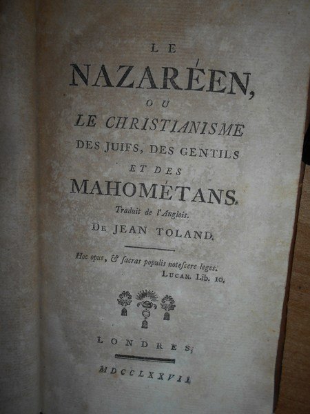Toland, Jean (1670-1722). Londres, 1777. Le Nazaréen, ou le christianisme des Juifs, des Gentils et des Mahométans. In-8°, piena pelle coeva, dorso decorato in oro. XLVII, (1), 261, (11) pp. Ottimo esemplare della rara edizione originale della traduzione francese ad opera del Barone d' Holbach. Scheda da completare. Bruniture in alcune pagine ma ben conservato. Casa