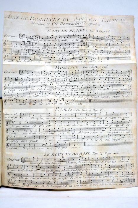 2 tomes en 1 volume. Tomes 3 et 4. Frontispice. 177 pages. + Frontispice. 161 pages. 1 planche dépliante illustrée d'une partition musicale. (14x9,5cm). Demi-chagrin noir. Dos lisse titré en lettres dorées. Plats en cartonnage couvert de papier marbré. Gardes marbrées. Coiffes légèrement élimées. Infimes défauts d'usage sur la reliure. Rousseurs sans gravité à l'intérieur. Etat agréable. Joli petit volume très bien relié dans un demi-chagrin noir du temps. 2 illustrations en frontispice et 1 planche dépliante illustrée d'une partition musicale.