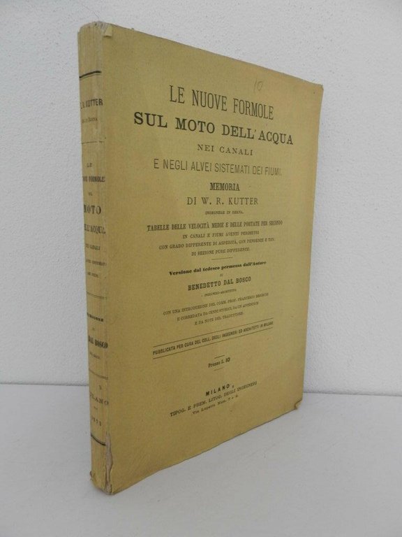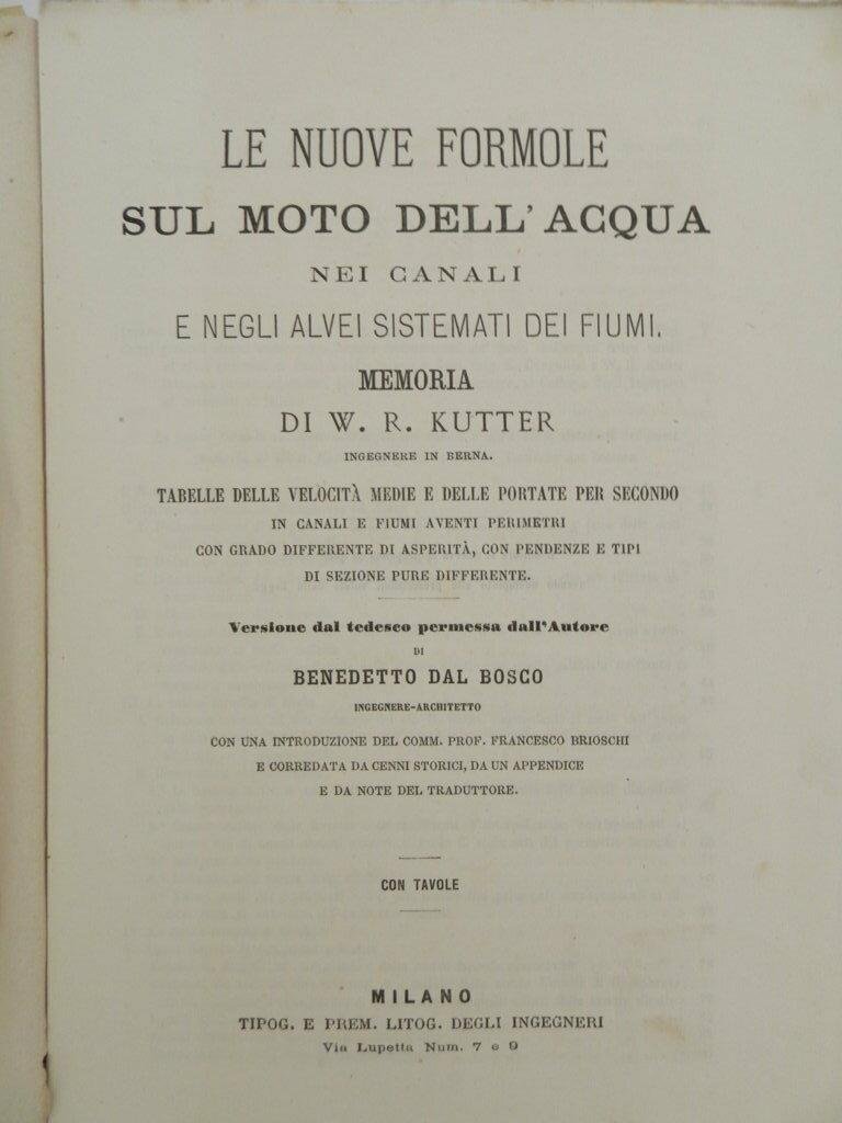 Le nuove formole sul moto dell'acqua nei canali e negli alvei sistemati dei fiumi. Memoria di W. R. Kutter ; versione dal tedesco permessa dall'autore di Benedetto Dal Bosco ; con una introduzione di Francesco Brioschi e corredata da cenni storici, da un appendice e da note del traduttore