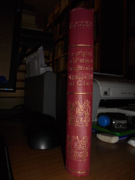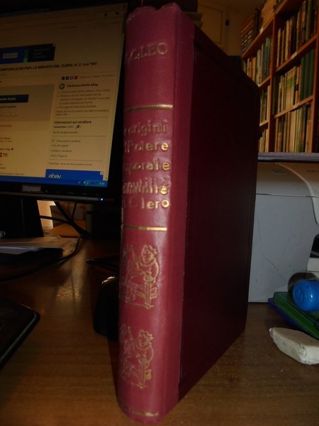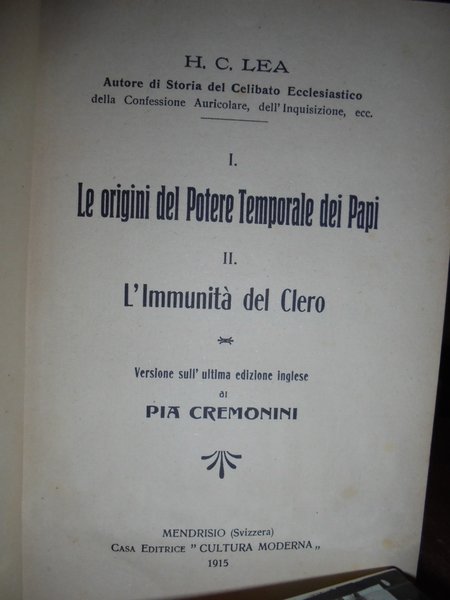 H.C.LEA. Mendrisio, Casa Editrice "Cultura Moderna", 1915. Le origini del Potere Temporale dei Papi - L'immunità del Clero. Versione sull' ultima edizione inglese di Pia Cremonini. In-16°, m.pelle coeva con fregi e titoli impressi a secco in oro sul dorso. 359, (1) pp. In ottimo stato di conservazione. Neg. mens. bianca cassa.