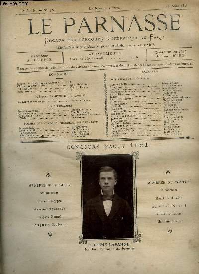 Le parnasse - organe des concours littéraires de Paris - 5e année n° 47 - Eugène Lapanne, biographie, Les légendes des andes par Germain Picard, Métempsychoses par Em. des Essarts, Cri de jeunesse par Hip. Buffenoir, Souvenir d'Alsace par Ch. Pérotte