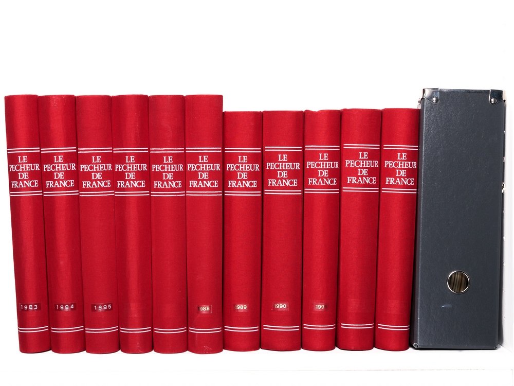 148 numéros in-4 br., rangés dans 11 classeurs éditeur pleine toile rouge et un emboîtage provisoire (pour les 25 derniers num.), couv. ill. couleur, photos couleurs ou noir et blanc, Le pêcheur de France, Organe officel de l'Union Nationale des fédérations départementales des A.A.P.P., S.E.P.I.E.L., Paris, 1983 à 1996, env. 70 pp. par numéro. Les classeurs sont au format 31 x 24 cm jusqu'en 1988, puis 29 x 22,5 cm. Bon état (lég. rouss. en int. de classeurs, bel ensemble par ailleurs) pour ensemble d'une revue mensuelle en couleurs. En 1983, ce magazine succédait à une ancienne formule, qui était imprimée sur papier journal et n'était qu'en noir et blanc. Le n° 1 de nouvelle formule correspondait au n° 53 de l'ancienne série. L'ensemble proposé ici permet de disposer des 13 premières années de ce magazine. Les quelques numéros manquants correspondent en général aux "cahiers techniques" paraissant en septembre, à partir de 1989. Un tel ensemble est peu courant. Linéaire total de 59 cm. Poids total de 32 Kg. Prix pour l'ensemble.