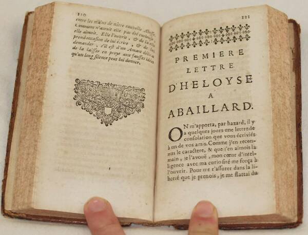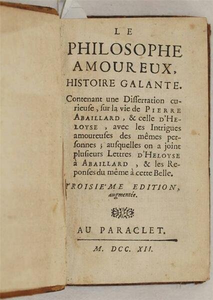 In 16. Dim. 15x9 cm. Pp. 46+(2)+272. Rara edizione del 1712 di questa opera anonima ma scritta da Francois Nicolas Dubois (m. 1750 ca). Si tratta del rimaneggiamento di un testo apparso nel 1676 sotto il titolo "Histoire des amours d'Abailard et d'Heloise" spesso attribuito a Jacques Alluis che narra la storia d'amore tra Pierre Abeilard e la giovane Heloise della quale era protettore. L'opera è in un volume ed è completa di tutte le pagine. Ex libris al contropiatto anteriore. Legatura in piena pelle coeva. Copertina in piena pelle coeva a cinque nervi con titolo su tassello al dorso in mediocri condizioni generali con usure e parti mancanti ai margini e dorso. Rotture alle cerniere. Legatura in buone condizioni. All'interno le pagine si presentano in buone condizioni con fioriture e bruniture. Scarce edition of 1712 of this anonymous work but written by Francois Nicolas Dubois (m. 1750 ca). It is the formation of a text appeared in 1676 under the title "Histoire des amours d'Abailard et d'Heloise" often attributed to Jacques Alluis talking about the love story between Pierre Abeilard and the young Heloise of which he was protector. The work is in one volume and it is complete of all pages. Ex libris in the internal part of front plate. Full leather coeval cover. Full leather coeval cover with five nerfs and spine title leather label in the spine in poor general conditions with wearings and missing parts in the edges and spine. Cracks in the hidges. Binding in good conditions. Inside pages are in good conditions with foxings and yellowings.