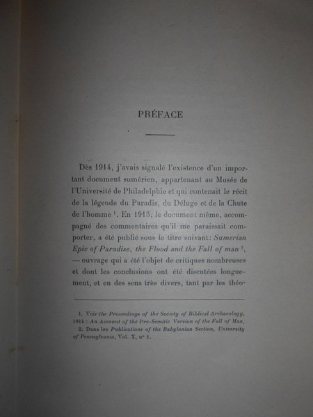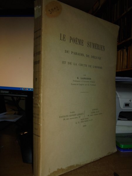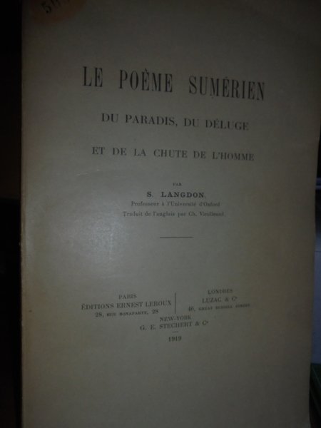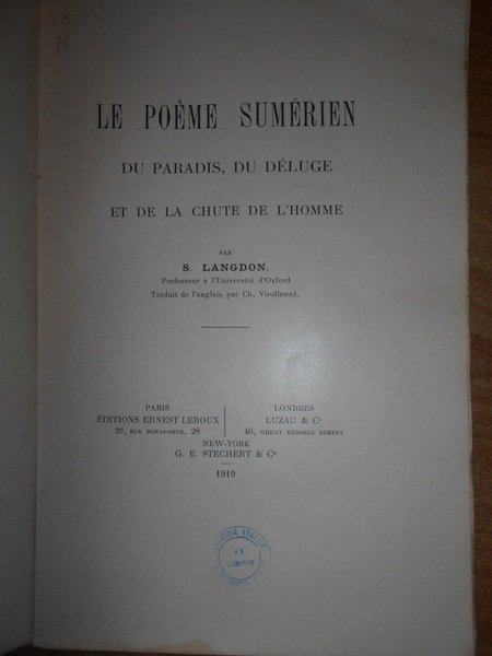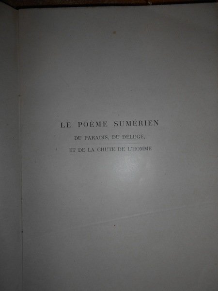 Par S. Langdon. Paris, éditions Ernest Leroux - Londres, Luzac & C. - New-York G.E. Stechert & C., 1919. Le Poème Sumérien du Paradis, du Déluge et de la Chute de l' Homme. In-8°, br. orig. X, 268. (1) pp. con 11 planche fuori testo. Bell' esemplare. Neg. mob. bianco grande in carpetta trasparente.