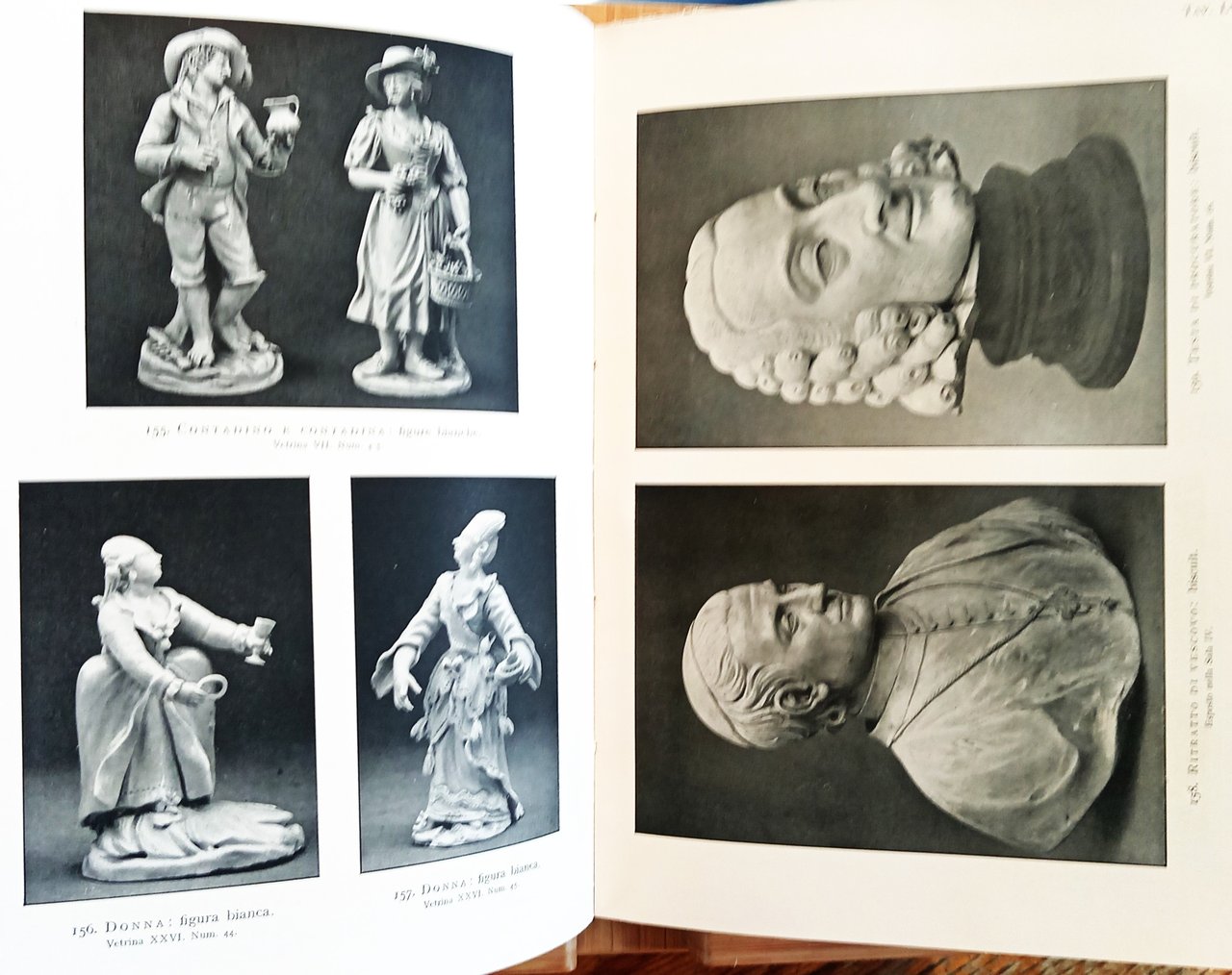 I ed. Catalogo della mostra organizzata da Nino Barbantiniche e allestita presso la Ca' Rezzonico di Venezia dal 25 aprile al 30 ottobre 1936. Indice: Le Porcellane di Venezia e delle Nove - Principali date e notizie relative alle Manifattura di Venezia e delle Nove (Manifattura Vezzi. 1719-40 - Manifatture Hewelcke. 1758-64 - Manifattura Cozzi 1765-1812 - Manifatture delle Nove. 1763-73 e 1781-1825) - Nota bibliografica - Catalogo degli esemplari esposti a Ca' Rezzonico nel 1936-XIV (nota - Sala A, vetrine I-VIII - Sala B, vetrine IX-XIV - Sala C, vetrine XV-XXI e supporti - Sala D, vetrine XXII-XXVI - Sala E, vetrine XXVII-XXXII) - Tavole (Cento tavole in b/n su carta patinata: tavole I-XXIV, opere appartenenti allla Manifattura Vezzi - tavole XXV-LXXVI, opere da riferire quasi tutte alla Manifattura Cozzi - LXXVII-C, opere appartenenti alla Manifattura delle Nove). In-8, pp. 44+C tavole con 281 illustrazioni (100 pp.)+2, brossura, copertina in carta grezza écru con illustrazione in b/n da stampa antica (un laboratorio ceramico con un tornitore e un decoratore). Le fotografie riprodotte nelle tavole sono da riferire per lo più al Cavalier Pietro Fiorentini di Venezia. Le rimanenti sono state eseguite dall'Archivio Fotografico del Museo di Milano, dall'Archivio Fotografico del Museo di Torino, dal Cavalier Ufficiale Piero Giacomelli di Venezia, dalla Fotografia Bruni di Milano e dalla Fotografia Longoni di Saronno. Stato buono (stato d'uso della copertina in carta écru ai margini. La copertina inoltre presenta qualche fioritura - pagine leggermente ingiallite)