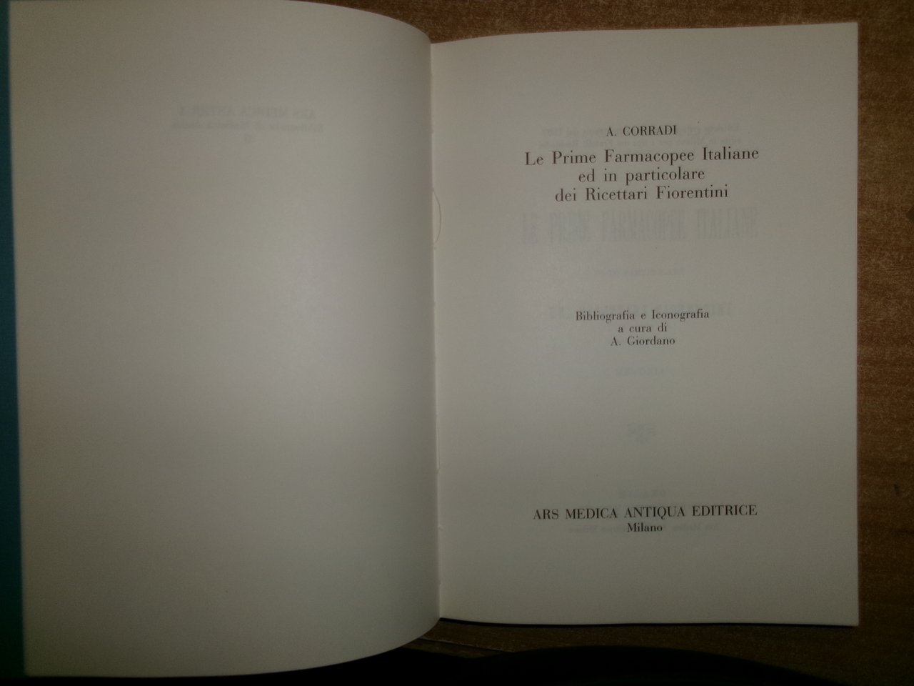 A. Corradi. Milano, ARS Medica Antiqua Editrice, 1984. Le Prime Farmacopee Italiane ed in particolare dei Ricettari Fiorentini memoria. Bibliografia e Iconografia a cura di A. Giordano. In-8°, cart. edit. con sovracopertina. 146 pp. con 58 tavole fuori testo. Come nuovo protetto da velina trasparente. Uff. C - IV - 7 - 2