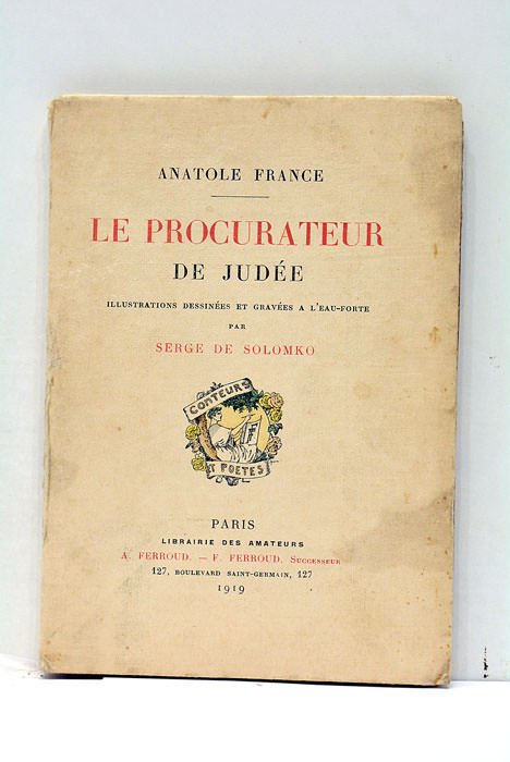 37 pages. (17,5x12cm). Broché sans couverture illustrée en couleurs rempliée. Salissures sur les plays. Petits accidents au dos. Coins et coiffes émoussés. Quelques rousseurs sans gravité. Cinq trés belles eaux-fortes hors-texte, vignettes, bandeaux et culs-de-lampe dessinés et gravés par Solomko. Exemplaire numéroté, imprimé sur vélin d'Arches.