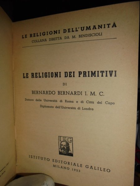 Bernardo Bernardi I.M.C. Milano, Istituto Editoriale Galileo, 1953. Le Religioni dei primitivi di Bernardo Bernardi I.M.C. In-16°, tela con titolo in oro sul dorso. viii, 247 pp. Ben conservato con alcuni appunti scritti a matita in poche pp. Neg. esot. mob. 13
