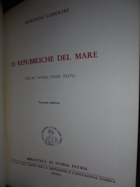 Armando. Lodolini. Roma, Biblioteca di Storia patria, 1967. Le repubbliche del mare. In-8°, tela rossa con titoli in oro al dorso e sovracopertina. 371, (5) pp. con 88 tavole fuori testo. In ottimo stato di conservazione. Neg. mob. 13 sotto esot.