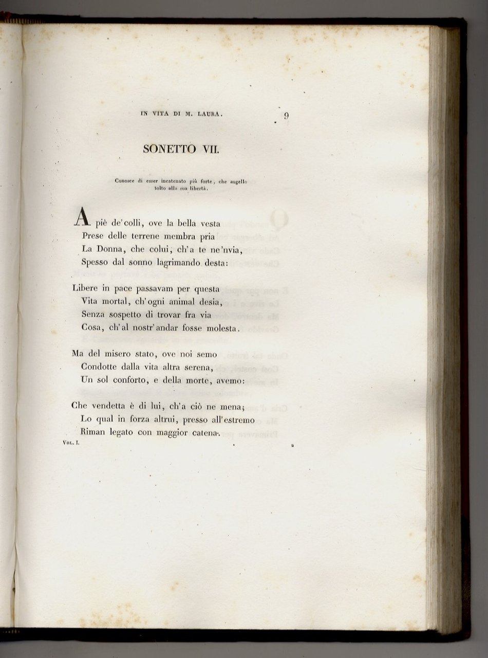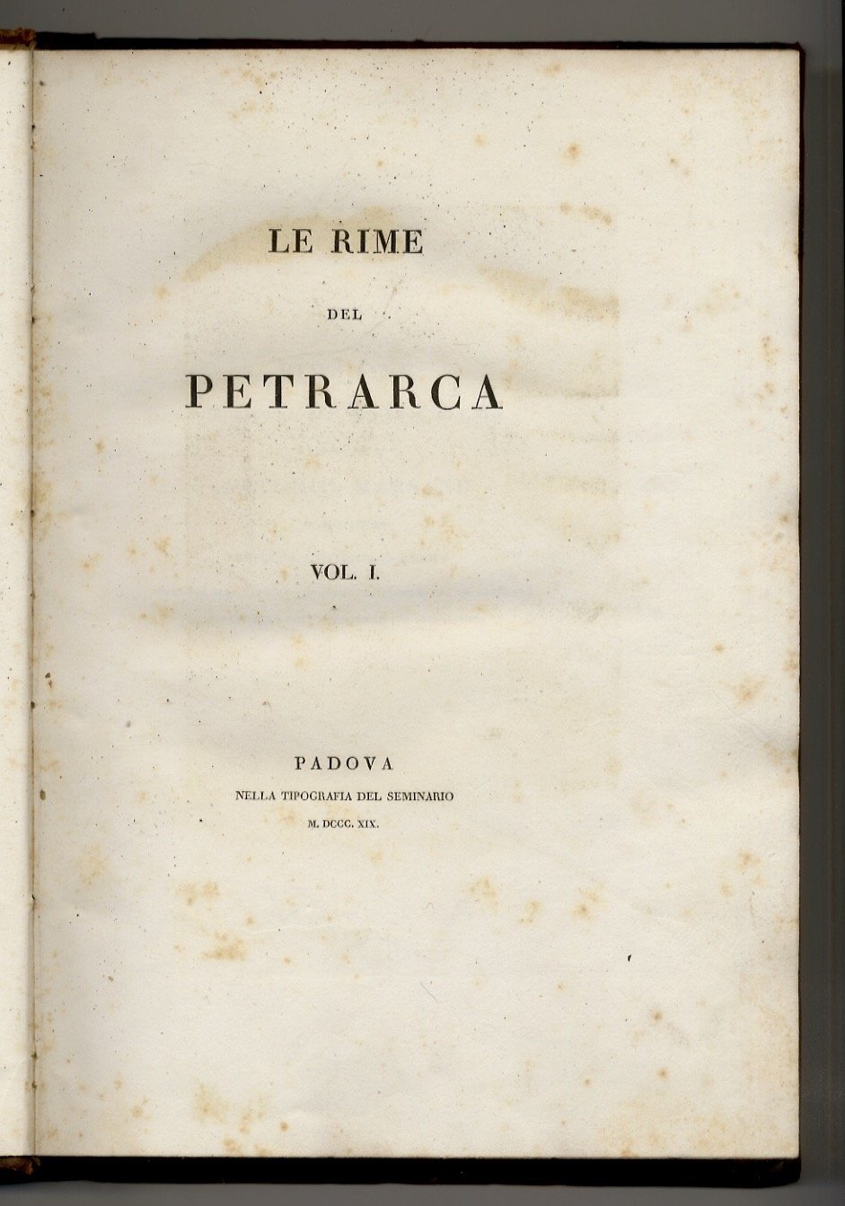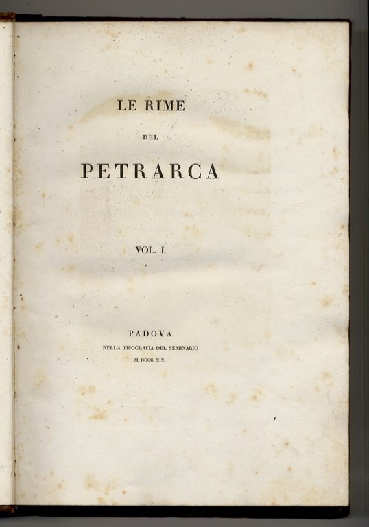 Padova, nella tipografia del Seminario, 1819 - 1820, volumi 2, in-4, legatura tardo-ottocentesca in mezza pelle con punte,pp. LIX, [1], 375, [1]- [4], 444, [4]. Con, complessivamente, 10 tavole fuori testo incise in rame, all'acquaforte e all'acquatinta, da Morghen, F. Lose, Bigatti (ritratto di Laura, ritratto di Petrarca, veduta di Valchiusa, facsimile di lettera del Petrarca, veduta di Selva-Piana, veduta di Arquà, veduta di Linterno, monumento in Arquà e monumento a Padova). Pregevole edizione. Gamba 749: "Edizione di 450 copie, tutte in carta velina [.] Il più nobile tributo si è questo che sia mai stato fatto al Cantore di Laura". In fine una bibliografia critica delle edizioni del Canzoniere collazionate dal curatore Antonio Marsand con gli esemplari della propria collezione che nel 1826 vendette a Carlo X. Qualche spellatura esterna, per il resto buon esemplare.