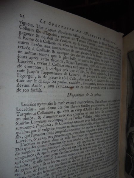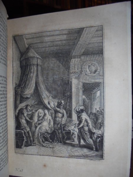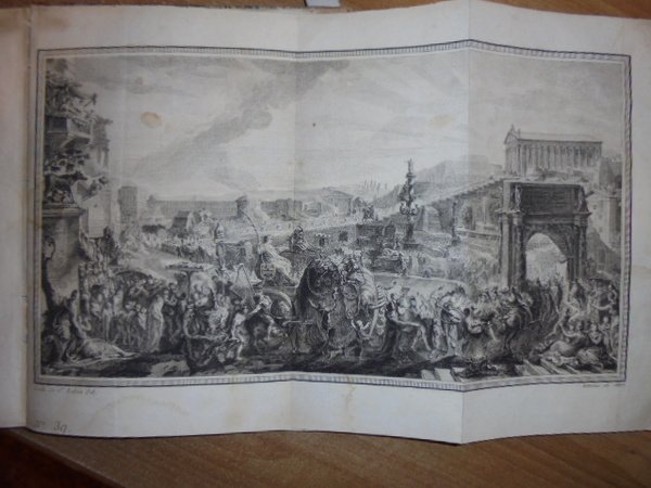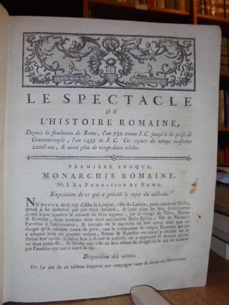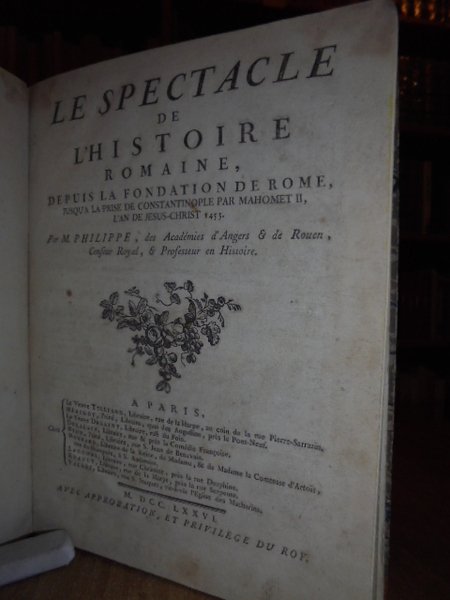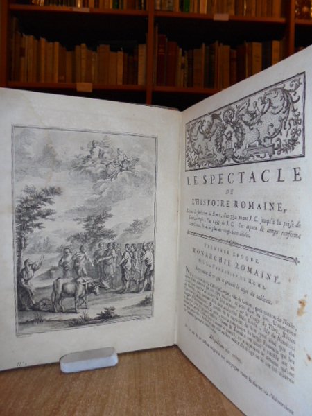 Le Spectacle de l' Histoire Romaine, depuis la fondation de Rome, jusqu'a la prise de Constantinople par Mahomet II, l' an de Jesus - Christ 1453. Par M. Philippe. Paris, Veuve Tilliard (et antres), 1776. In - 4°, m. pelle (dorso un po' logoro). iv, 68 pp. e 39 (anziché 40) tavole incise in rame f.t. Manca la tavola n° 12. Pregevole opera illustrata del Settecento francese. << Carte et 40 planches desquelles 9 sont d' après Gravelot, 3 d' après Eisen, 3 d' après Blomey, et 25 d' après G. de Saint - Aubin, gravés par Aveline, Chenu, Courtois, Legrand, Lorraine, Pelletier, A. de Saint - Aubin et Tardieu. >> (Cohen - Ricci, 199). Neg. Mob. 5