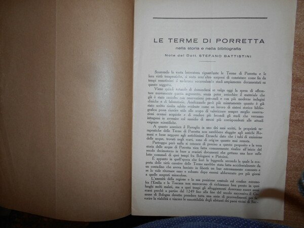 STEFANO BATTISTINI. Livorno, Arti Grafiche S. Belforte & C., 1933. Le Terme di Porretta nella storia e nella bibliografia. In-8°, br. orig. 11 pp. Opuscolo ben conservato. Neg. scat. 2 opuscoli nonn. parav