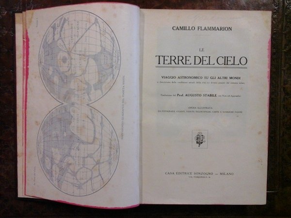 Molto buono. Mezza pelle coeva con titoli e fregi oro al dorso e 4 nervi. Tagli rossi, in - 8 gr, copertina ill. e retro cop. originali all'interno, 735 pp. Traduzione del prof. Augusto Stabile, con note ed appendici. Opera illustrata da fotografie celesti, vedute telescopiche, carte e numerose figure. Due firme a matita, macchioline e 3 strappetti riparati (pp 605 / 606, 607 / 608, 609 / 610). Dorso parzialmente scollato (vedi immagine)
