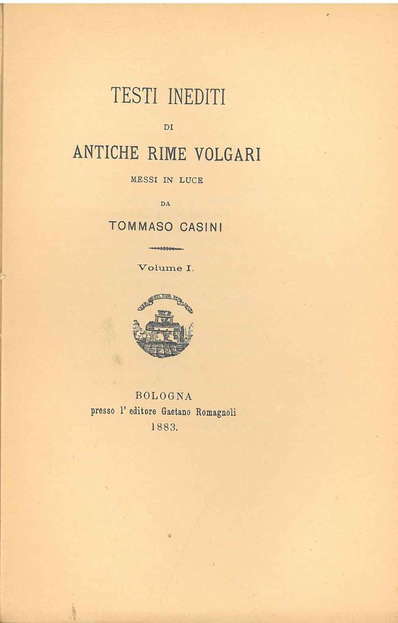 Le Testi inediti di antiche rime volgari messi in luce da Tommaso Casini. Volume I (il solo stampato). Scelta di curiosità letterarie inedite o rare dal secolo XIII al XVII in appendice alla collezione di opere inedite o rare