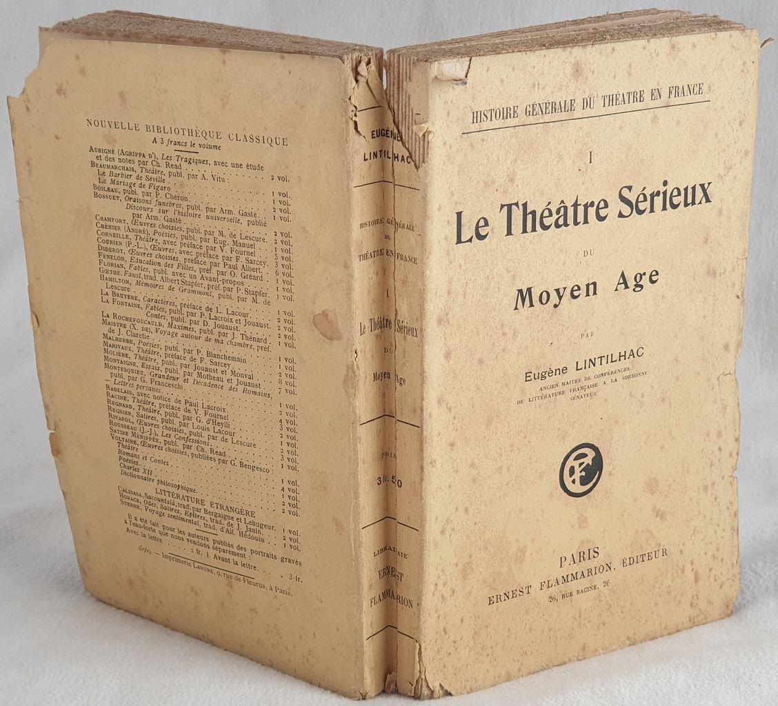 Edizione dei primi del novecento del teatro serio del medioevo scritto da Eugene Lintilhac. All'interno: origini bizantine liturgiche e scolare del teatro moderno, repertorio e messa in scena, il dramma biblica, il dramma agiografica, dramma profano ecc. il volume in se completo faceva parte dell'opera in cinque tomi sulla storia generale del Teatro in Francia. In buone condizioni. Copertina editoriale in discrete condizioni generali con usure ai margini e dorso. Legatura in discrete condizioni con qualche rottura. All'interno le pagine si presentano in buone condizioni con fioriture. In 8. Dim. 19x12 cm. Pp. (4)+339. Edition of early 20th century of serious theatre of middle age written by Eugene Lintilhac. Inside: liturgical and scholar bizantine origins of modern theatre, biblic drama, hagiographic drama, prophane drama etc. The volume complete in itself belonged to the work in five tomes general serious Theatre in France. In good conditions Editorial cover in fair general conditions with wearings in the edges and spine. Binding in fair conditions with some cracks. Inside pages are in good conditions with foxings. In 8. Dim. 19x12 cm. Pp. (4)+339.