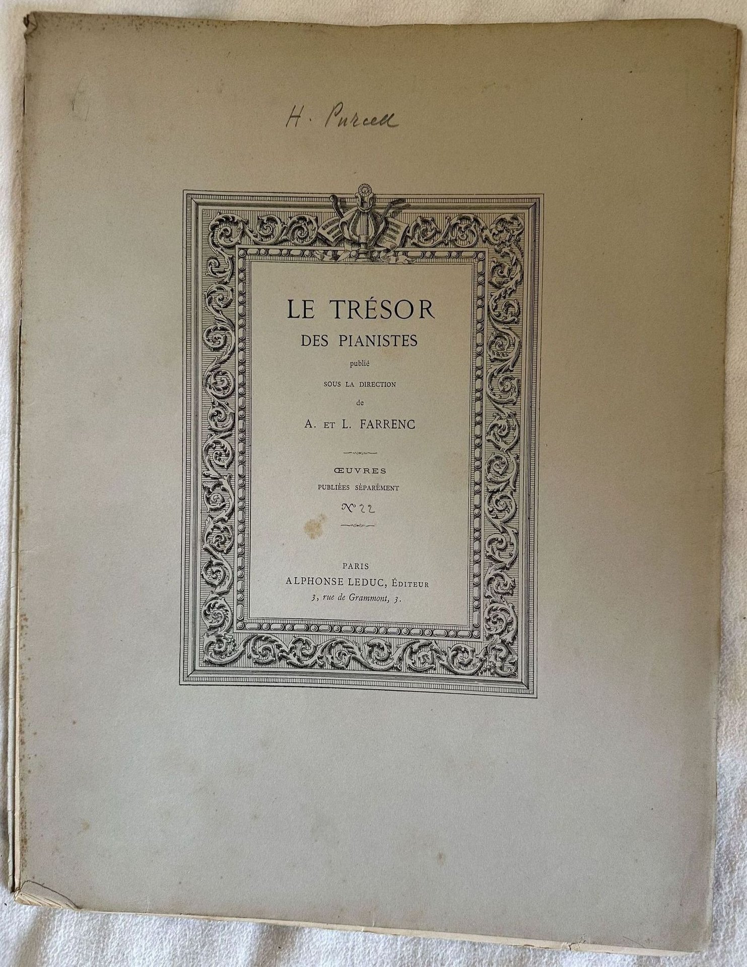 Edizione dei primi del novecento della melodia "Trente-cinq pieces pour le clavecin di Henri Purcell (1659-1695) della collana "Le tresor des pianistes" curata dalla pianista francese Luise Farrenc (1804-1875) In buone condizioni. Copertina editoriale in discrete condizioni con lievi usure marginali. Piatti quasi staccati. Legatura editorialmente assente. Pagine in buone condizioni con rare fioriture. In Folio. cm. 35,5x27. Pp. 11, 17.Edition of early 20th century of the melody "Trente-cinq pieces pour le clavecin di Henri Purcell (1659-1695) of the series "Le tresor des pianistes" cared by the french piano player Luise Farrenc (1804-1875) In good conditions. Editorial cover in fair conditions lightly worn in the extremities. Plates almost totally detached. Binding is editoriarly missing. Pages in good conditions with occasional foxing. In Folio. cm. 35,5x27. Pp. 11, 17.