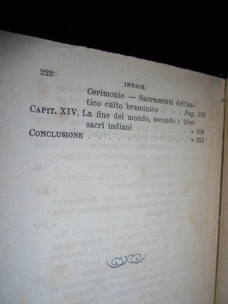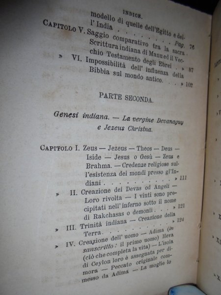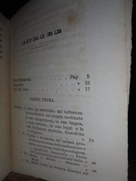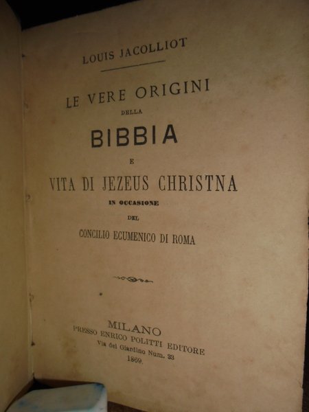 JACOLLIOT, Louis Le vere origini della Bibbia e vita di Jezeus Christina in occasione del Concilio Ecumenico di Roma. Milano, presso Enrico Politti Editore, 1869. In-16°, cartoncino marmorizzato coevo, 222 pp. Prima ed unica edizione di quest' opera rara. In ottimo stato di conservazione. Louis Jacolliot (Charolles, 31 ottobre 1837 – Saint-Thibault-des-Vignes, 30 ottobre 1890) è stato uno scrittore, orientalista e indologo francese, poco dopo essersi laureato in legge, nel 1869 si trasferiva nell'India francese, ove esercitò per anni la professione di giudice, venendo a contatto con diversi gruppi culturali, assai riservati, del cosmo religioso indù. Buon conoscitore dei miti indù, si accontentò di restituirli, per un pubblico di lettori borghese del proprio tempo, non badando a rigore filologico. Ancora molto interessante, il suo capolavoro Voyage aux ruines de Golconde. Casa mob. grande