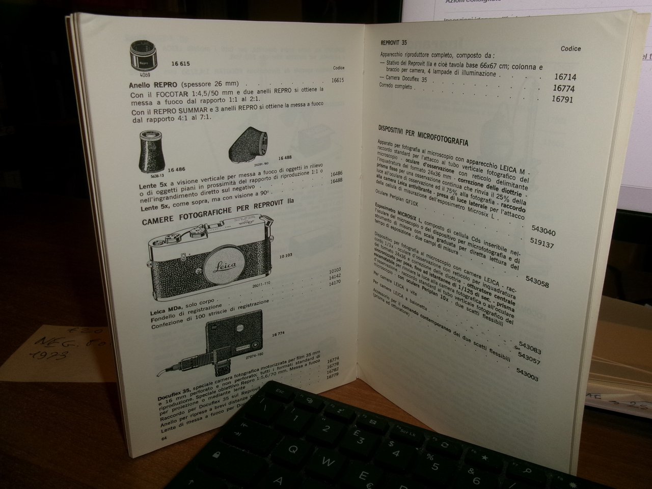 LEICA. Foto-Cine-Ingrandimento-Proiezione-Binocoli. Catalogo generale. Genova, Ditta Giuseppe Lang, 1973. In-16° grande, cart. edit. 121 pp. con numerose illustrazioni in bianco e nero n.t. Ottimo stato. Neg. Fot. mob. N