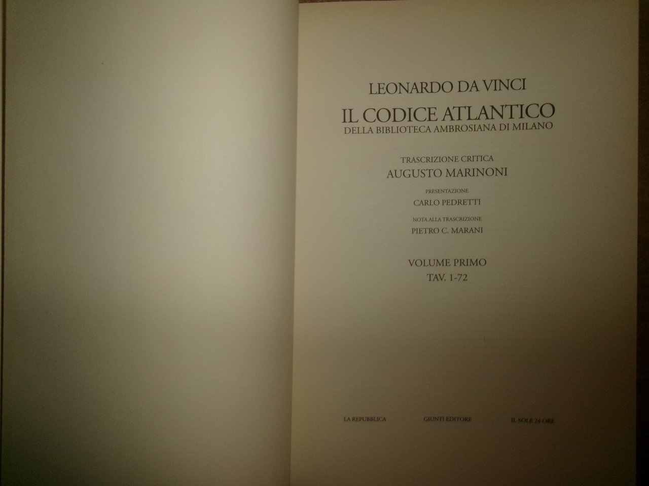 LEONARDO DA VINCI. Il Codice Atlantico Volume 1. 2006. Milano, Amilcare Pizzi, 2006. In-4° grande, cartonato edit. con sovracopertina. Tavole 1-72 - Testo: 14 pp. poi da pag. 179 a pag. 284. con tavole in bicromia f.t. Ottimo stato Neg. sport 1 da Vinci.