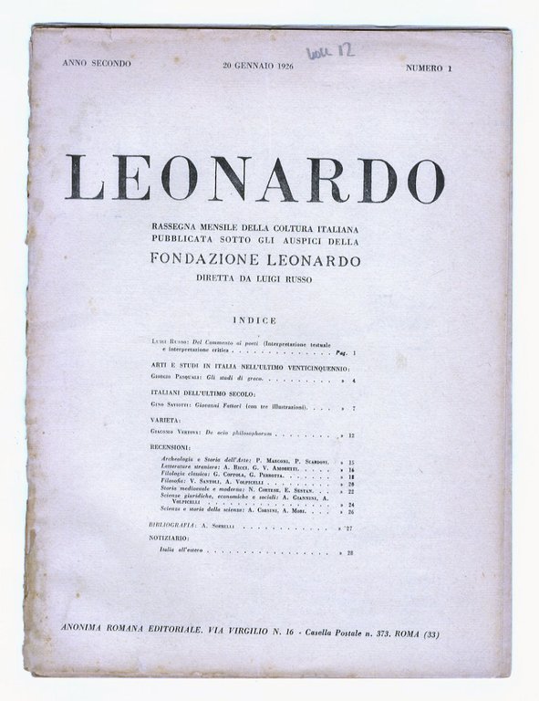 LEONARDO. Rassegna mensile della coltura italiana pubblicata sotto gli auspici della Fondazione Leonardo, diretta da Luigi Russo. Anno secondo. 1926: nn. 1-12. Annata completa.