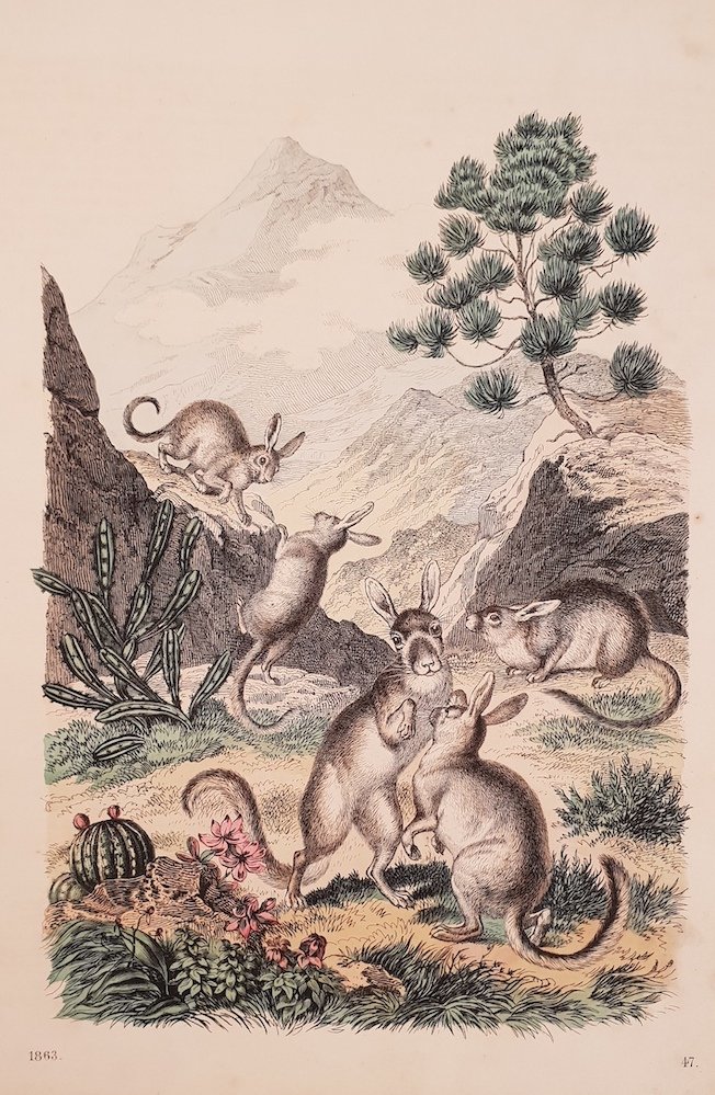 Bella incisione colorata a mano del 1863 che rappresenta una scena naturale con la lepre del deserto. Planche estratta da libro. TECNICA: Incisione su acciaio colorata DIMENSIONI FOGLIO: cm 26x19,5 DIMENSIONI INCISIONE: cm 21x14,5 EPOCA: 1863 In buone condizioni, qualche fiorituraNice coloured engraving of 1863 representing a natural scene with a nero tailed jackrabbit. Planche removed from a book In good conditions, foxings. TECHNIQUE: coloured steel engraving LEAF SIZE: cm 26x19,5 PRINT'S SIZE: cm 21x14,5 PERIOD: 1863