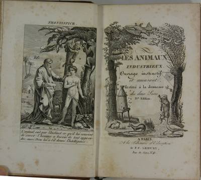 Edition Lehuby, Paris, 1836. In-12 (16 x 11 cm) reliure plein veau du temps, dos lisse à pièce de titre noire et décor doré, tranches marbrées, frontispice et page de titre gravée, 6 gravures, 2 f., 322 p., 4 f. Manque la coiffe inférieure et usures sur les mors, rousseurs éparses. Quadrupedes, oiseaux, ovipares et serpens, poissons, insectes. Entre autres animaux : le renard, la loutre, le furet, l'éléphant, le singe, le lapin, la gelinotte, le coq de bruyères, la perdrix, l'outarde, .