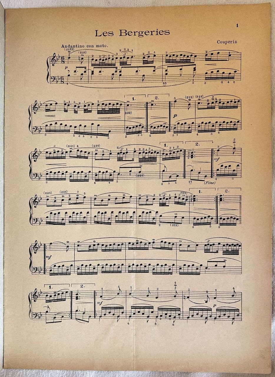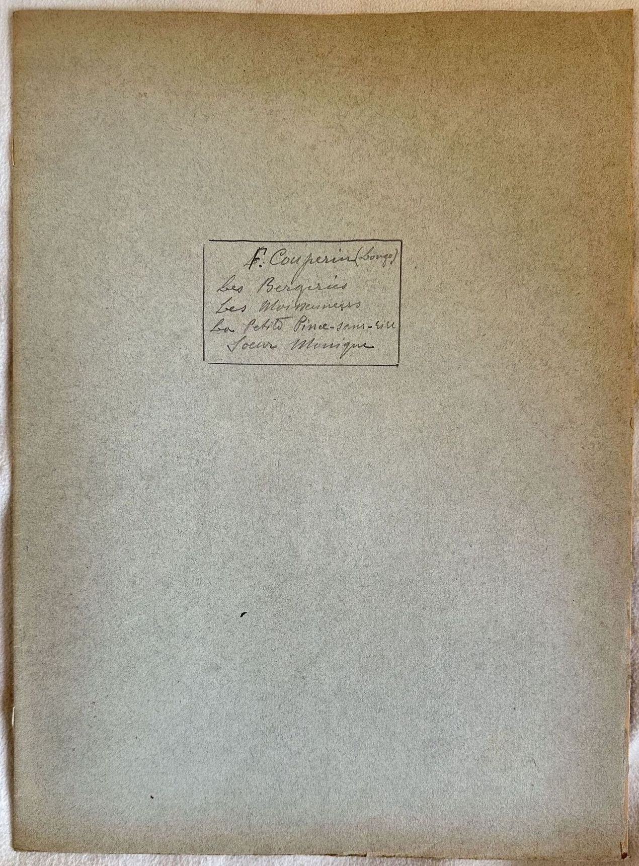 Edizione di inizio novecento di quattro melodie del compositore barocco Francois Couperin (1668-1733). All'interno: Les bergeries; Les moissenneurs; La petite pince-sans-rire. In buone condizioni. Copertina morbida in buone condizioni con lievi usure marginali. Legatura editorialmente assente. Pagine in buone condizioni con rare fioriture. Piegatura verticale. In Folio. cm. 35x27. Pp. 8. Edition of earlu 20th century by the baroque composer Francois Couperin (1668-1733). Inside: Les bergeries; Les moissenneurs; La petite pince-sans-rire. In good conditions. Soft cover in good conditions lightly worn in the extremities. Binding editoriarly missing. Pages in good conditions with occasional foxing. Vertical folding. In Folio. cm. 35x27. Pp. 8.