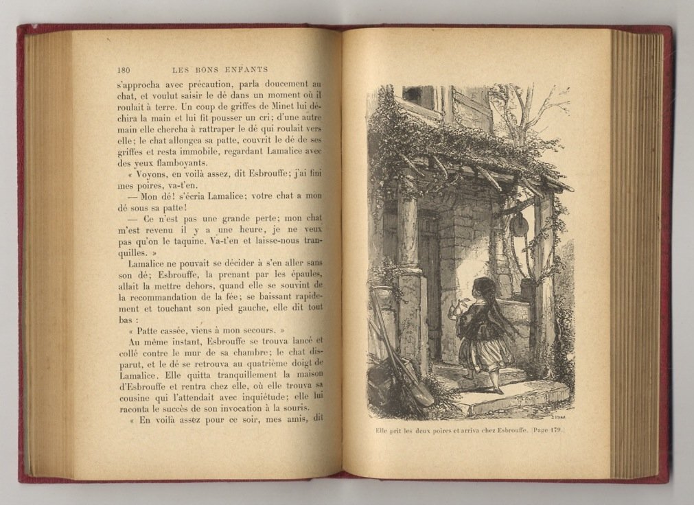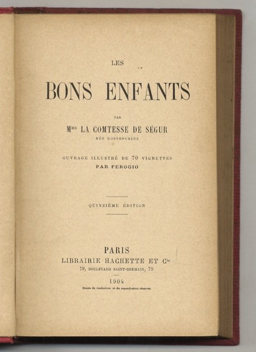 Paris, Librairie Hachette et Cie, 1904, in-16, tela editoriale rossa, con dorature al piatto anteriore e titolo oro al dorso, tagli dorati, pp. (4), 380, (8). Con illustrazioni in b.n. f.t. Cartellino della Libreria R. Paggi, via Tornabuoni 15, Firenze. Dedica manoscritta al foglio di guardia anteriore “Bibliothèque Rose Illustrée”. Ottime condizioni.