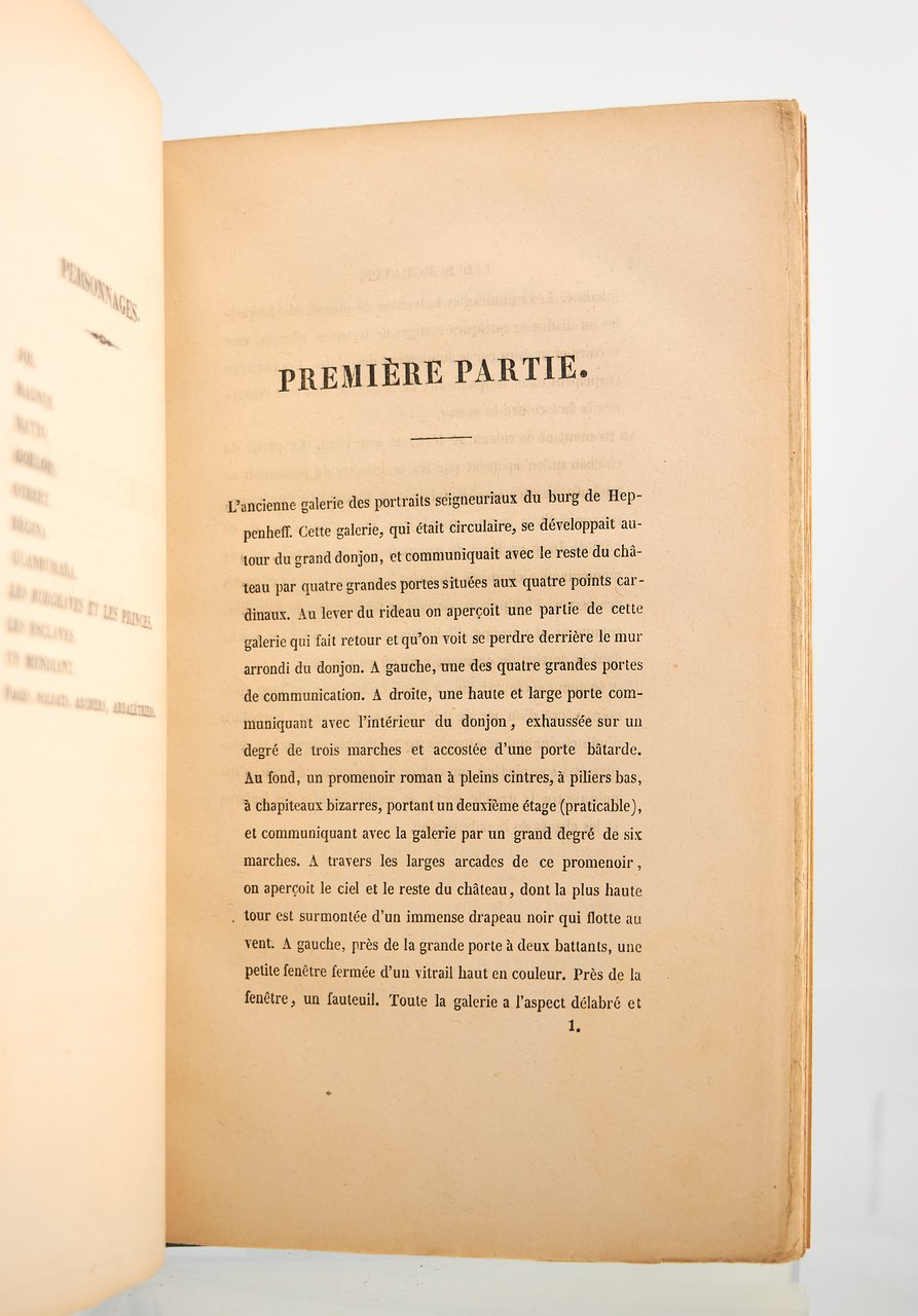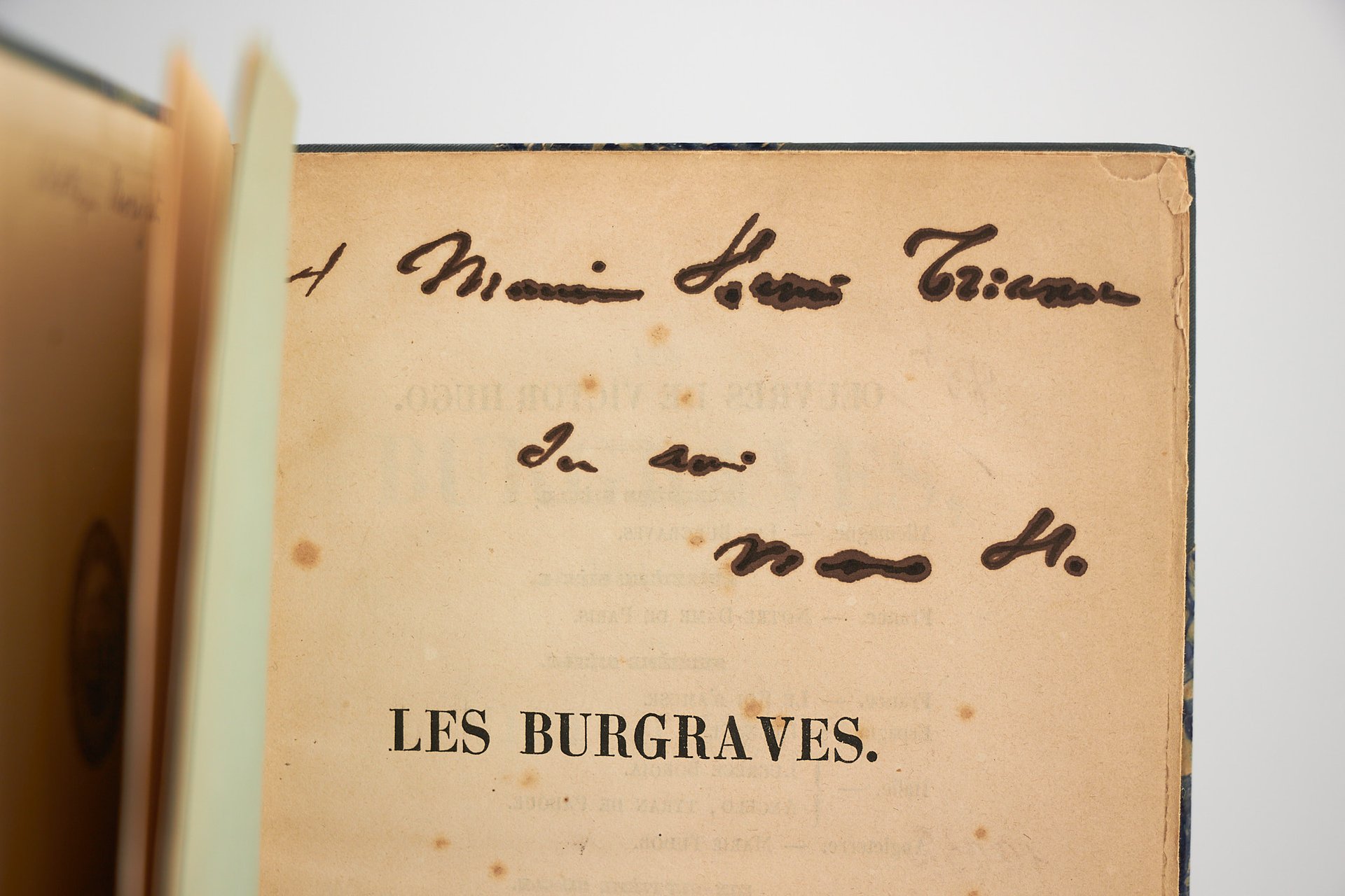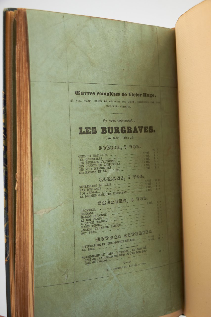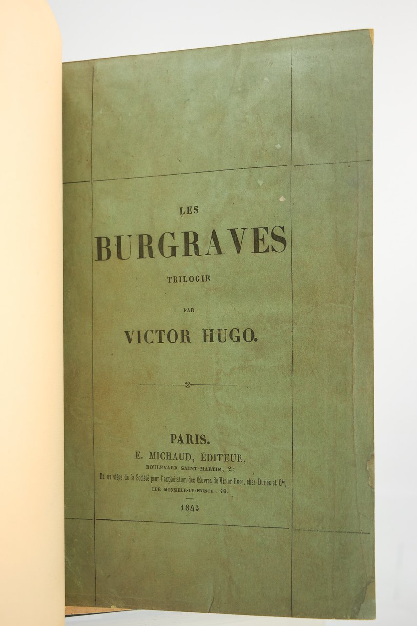 E. Michaud | Paris 1843 | 14.50 x 23.50 cm | relié | First edition. Half blue-grey cloth Bradel binding over marbled paper boards by Champs, spine with gilt stylized floral motif, date and double gilt fillet to foot, navy blue shagreen title-piece with a small angular lack to top, covers preserved. Autograph inscription signed by Victor Hugo to his friend, the literary critic Henri Trianon. Small manuscript correction to the first page of the introduction, a few small wormtracks to the title and half-title. Provenance : Morizet collection, collection of Raymond Boueil with his engraved ex libris, Maurice Escoffier (Le mouvement romantique N°1557), Robert Schumann, manuscript initials (1965, N°207) and Philippe Zoummerouff (2001, N°62). * [FRENCH VERSION FOLLOWS] | Edition originale. Reliure à la bradel en demi percaline bleu-gris à coins, dos lisse orné d'un motif floral stylisé doré, date et double filet dorés en queue, pièce de titre de chagrin marine comportant un petit manque angulaire en tête, plats de papier marbré, couvertures conservées, reliure signée de Champs. Envoi autographe signé de Victor Hugo à son ami le critique littéraire Henri Trianon. Petite correction manuscrite sur la première page de l'introduction, quelques piqûres sur les pages de titre et de faux-titre. Provenances : des bibliothèques Morizet, Raymond Boueil avec son ex-libris gravé, Maurice Escoffier (Le mouvement romantique N°1557), Robert Schumann avec ses initiales manuscrites (1965, N°207) et Philippe Zoummerouff (2001, N°62).