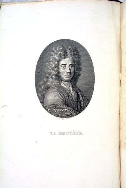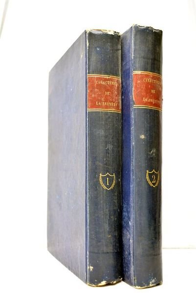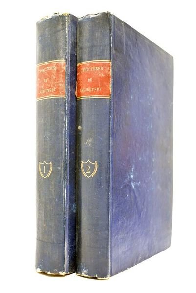 2 volumes grand in-8. Portrait. 2 feuillets. 432 pages. 1 feuillet. + 2 feuillets. 408 pages. (24x15,5cm). Cartonnage de l'époque à la Bradel. Dos lisse orné d'une pièce de titre de maroquin rouge et d'une tomaison dorée. Exemplaire non rogné. Usures aux coiffes, coins et mors. Rousseurs. Exemplaire sur papier vélin de cette édition des Caractères, établie d'après celle de 1697, la "meilleure de toutes", selon l'abbé Olivet. Les derniers dénoncent les pratiques de quelques uns de leurs confrères consistant à donner les clés du texte ou à expliquer les périphrases. Quelques rousseurs, mais agréable exemplaire non rogné dans son cartonnage de l'époque.