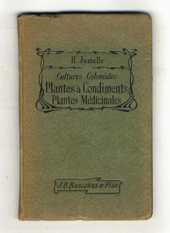 Paris, Librairie J.-B. Baillière et Fils, 1914, in-16, cartone editoriale, pp. 119, (1). Con 31 illustrazioni in b.n. nel testo e note bibliografiche. "Bibliothèque Coloniale", n. 4. Fra le specie botaniche di coltivazione coloniale ad uso medicinale: cola, canfora, coca, cinchona (chinino); fra le aromatiche: pepe, garofano (chiodi), capsico, pimento, cannella, vaniglia, cardamomo, zenzero. Ottime condizioni.