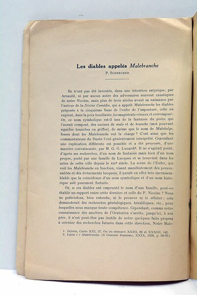 3 pages. (24x16 Cm). Broché. Couverture imprimée. Petites rousseurs et salissures. Coiffe supérieure légèrement pliée. Extrait de la Revue Philosophique de la France et de l'étranger. Schrecker cherche l'origine du nom donné aux diables "préposés à la cinquième fosse de l'enfer de l'imposture".