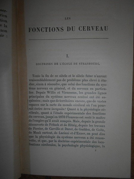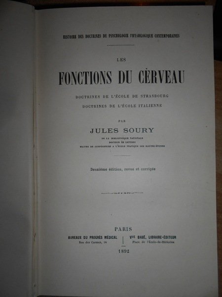Jules, Soury. Paris, Bureaux du Progres Médical, 1892. Les Fonctions du Cerveau doctrines de l' école de Strasbourg. Doctrines de l' école italienne. In-8° piccolo, tela con titolo in oro entro tassello al dorso. XVI, 470 pp. Bell' esemplare in legatura recente con alcune note nella prefazione. Uff. C - III - 7