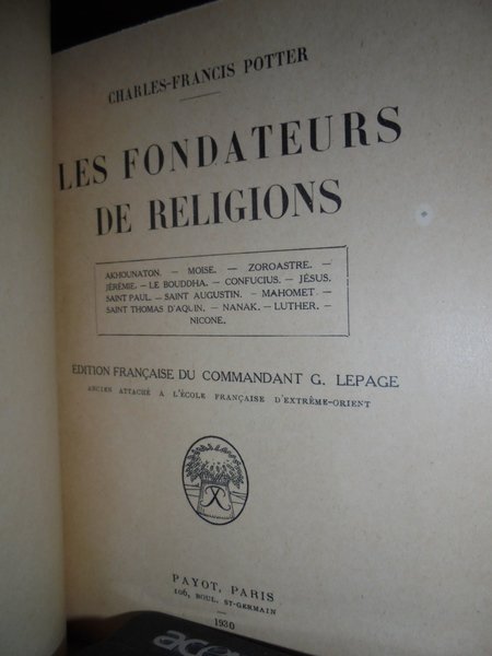 Charles-Francis Potter. Paris, Payot, 1930, Les Fondateurs de Religions. In-16° grande, br. 425, (2) pp. In ottimo stato di conservazione. Neg. esot. mob. 101