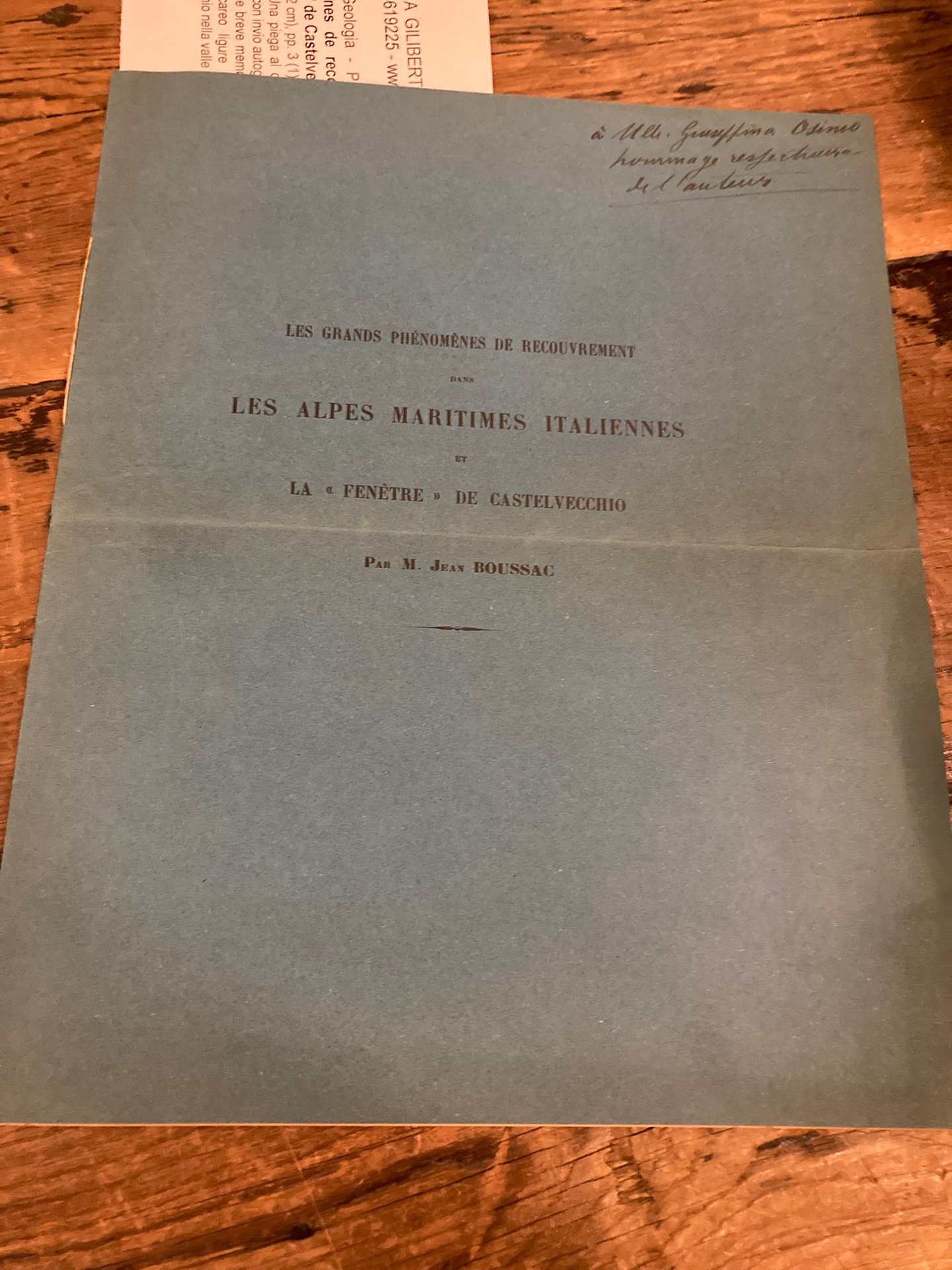 In-4° (27x22 cm), pp. 3 (1) bianca, brosura editoriale azzurra legata con filo, titoli in nero al piatto anteriore. Una piega al centro, taglietti al filo del margine esterno laterale ma più che buon esemplare con invio autografo dell' autore al piatto anteriore. Non comune breve memoria sotto forma di estratto circa le relazioni tettoniche fra la zona del Flysch calcareo ligure e quella del Briançonnais. Particolare attenzione alla Finestra di Castelvecchio nella valle di Neva.