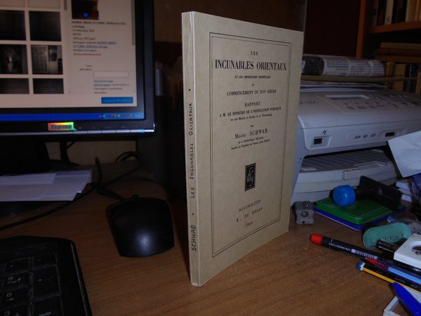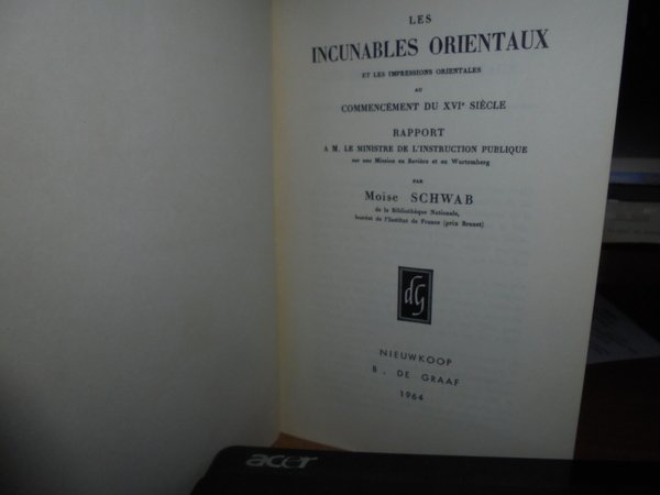Moïse Schwab. NIEUWKOOP, B. DE GRAAF, 1964. Les INCUNABLES ORIENTAUX et les impressions orientales. In-16° grande, cart. edit. 138 pp. con illustrazioni in bianco e nero nel testo. Come nuovo. Uff. A - II - 3 - 2